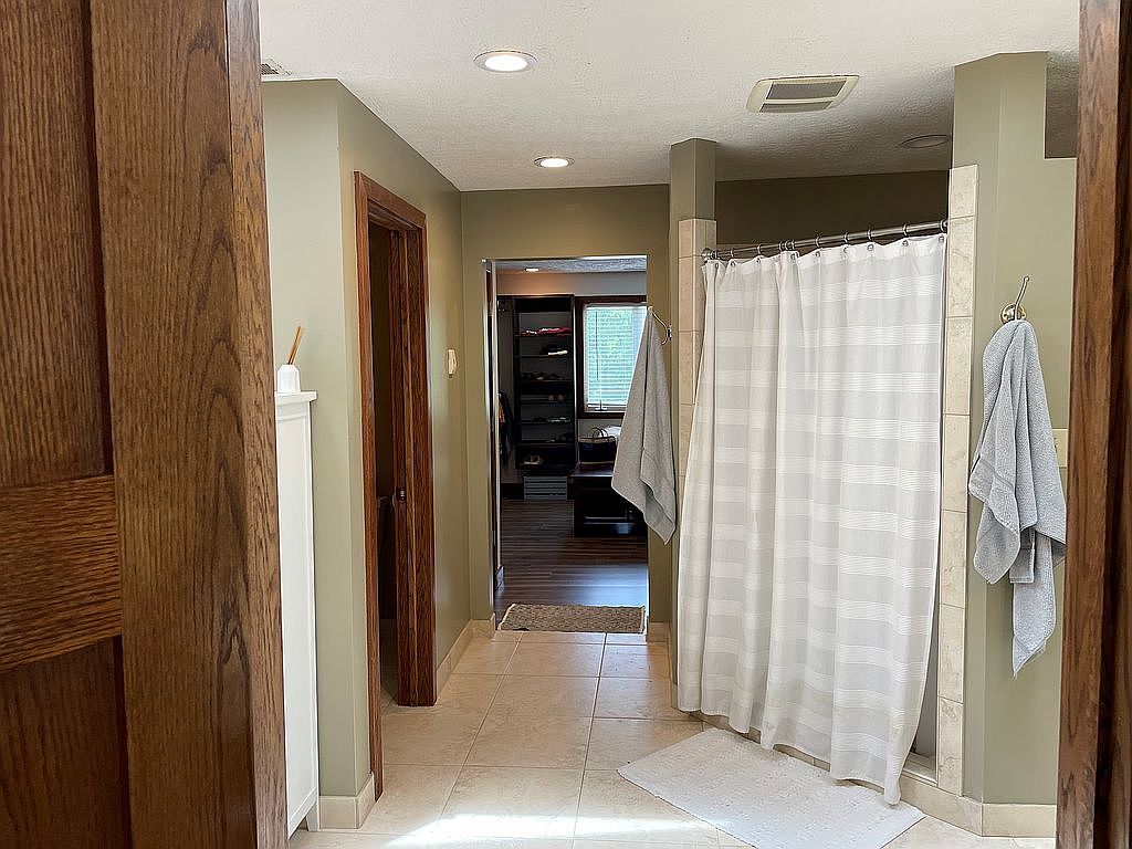 This bathroom features a clean, functional layout with soft olive-green walls paired with warm wood door frames, creating a cozy, earthy atmosphere. The beige tiled floor adds a light, neutral base that complements the room’s tones. A walk-in shower is enclosed by a white, subtly patterned curtain, accented by matching white bath rugs on the floor. Two gray towels hang neatly on wall hooks, adding practical elements without interrupting the muted color scheme. Recessed ceiling lights provide ample illumination, while the view toward an adjoining room with dark wood flooring and window light adds depth to the space.