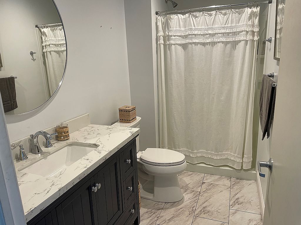 This bathroom features a clean, modern design with a monochromatic color palette primarily in shades of white and gray. The centerpiece is a dark wooden vanity with a white marble countertop accented by subtle gray veining. A rectangular undermount sink with polished chrome fixtures sits below a large, round mirror that adds softness to the space. The floor is tiled with large, light gray marble-look tiles that complement the countertop. The bathtub area is separated by an off-white fabric shower curtain with intricate lace detailing, offering a touch of vintage charm. Overall, the space is both functional and elegant.