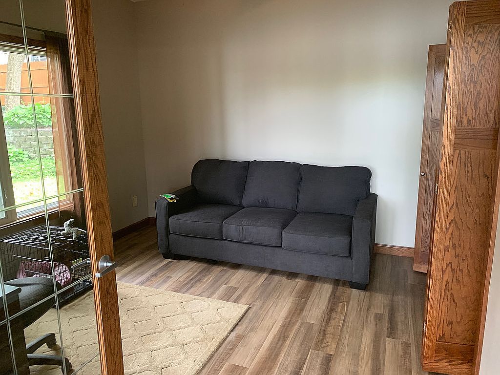 This compact room features warm wood tones with medium brown hardwood flooring and matching baseboards, complemented by oak wood framed French doors with glass panels. A dark gray three-seater sofa sits flush against a plain off-white wall, creating a clean and simple focal point. An area rug in soft beige adds subtle texture and comfort underfoot near the doorway. The corner reveals a wooden closet door with a natural oak finish consistent with the door frame and floor trim. Natural light filters softly from an adjacent window, highlighting the cozy yet minimalist atmosphere of this sitting area.