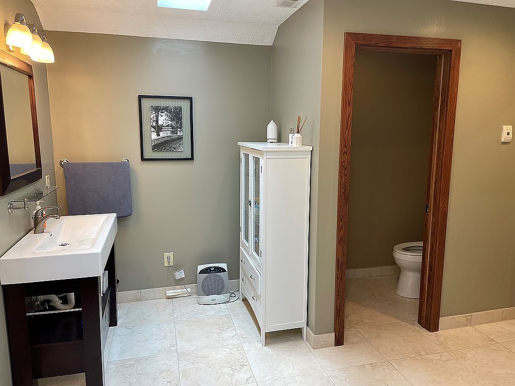 This bathroom exhibits a clean and functional layout with neutral, earthy tones dominating the space. The walls are painted a soft taupe, enhancing the warm, inviting feel. Creamy beige tiles cover the floor, giving the room a smooth and polished finish. A white porcelain sink sits atop a dark wood vanity, offering contrast and modernity alongside a large rectangular mirror with a matching wooden frame. The space is accessorized minimally with a blue hand towel and a black-and-white photo on the wall for subtle decor. A white cabinet with glass doors offers storage, and the separate water closet is framed with rich wood trim, contributing to the room’s balanced blend of traditional and contemporary styles.