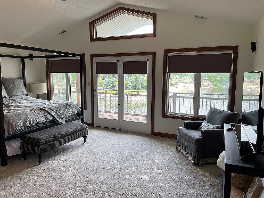 This spacious master bedroom features a vaulted ceiling accentuated by a triangular upper window, allowing natural light to flood the space. French doors and large windows frame serene lake views, creating a calming atmosphere. The neutral palette is dominated by soft beige carpeting and light-colored walls with dark wood trim providing contrast. Furnished with a black four-poster bed dressed in gray bedding, a striped upholstered bench, and a comfortable gray armchair paired with a TV on a black media console, the room blends classic and modern elements for cozy relaxation and picturesque scenery.