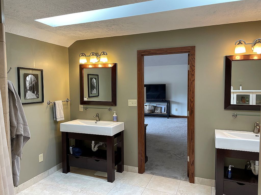 This bathroom features a spacious layout with earthy olive green walls contrasted by light tan tile flooring. Two dark wood framed vanities with white rectangular sinks anchor the space on either side of a wooden doorframe leading to an adjacent carpeted room. Above each sink, square mirrors with matching dark wood frames are illuminated by classic triple sconce light fixtures casting a warm glow. A skylight adds natural daylight, enhancing the soft, neutral palette. Towels are neatly hung on chrome rails, and a monochrome framed photograph adds a subtle artistic touch to the corner wall.