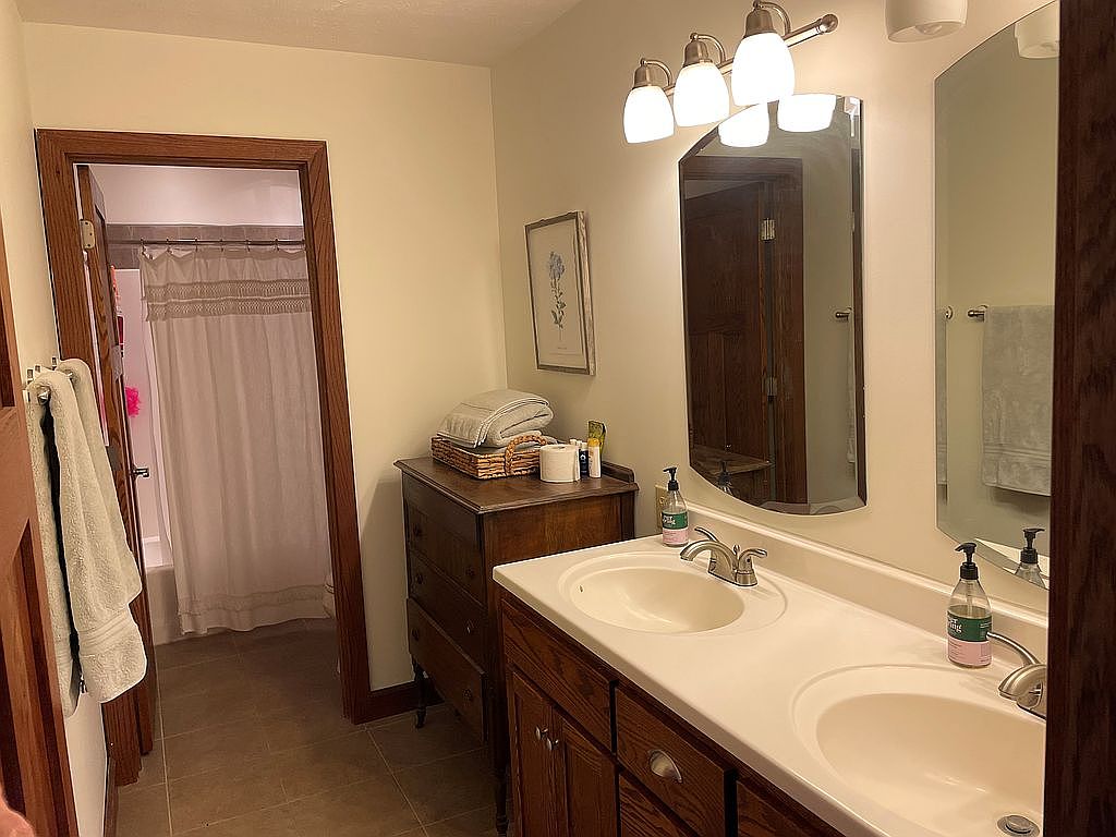 This bathroom features a dual-sink vanity with a cream-colored countertop and matching integrated sinks, complemented by polished silver faucets. The cabinetry below is crafted from dark wood with distinct grain patterns, adding warmth and traditional charm. Above the sinks, two rectangular mirrors reflect the space, framed by a set of four modern light fixtures with frosted glass shades, offering ample illumination. Adjacent is a dark wood chest of drawers serving as additional storage, topped with neatly folded towels and toiletries. The walls are painted a soft beige, with matching brown tile flooring. A glimpse into the adjoining shower area reveals a beige curtain that enhances the neutral, calming color palette.