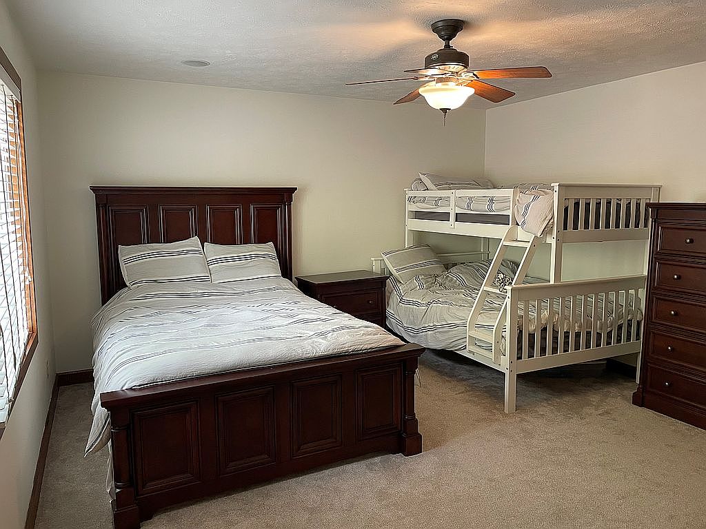 This cozy bedroom blends functionality and comfort, featuring a dark wood queen bed with detailed paneling as a focal point. Adjacent to the main bed is a white twin-over-full bunk bed with matching striped bedding, optimizing space for multiple occupants. A dark wood nightstand and matching tall dresser frame the room, harmonizing with the queen bed’s finish. Soft beige carpeting cushions the floor, complementing the neutral wall color. Natural light filters in through a window with wooden blinds, while a ceiling fan with a light fixture provides both illumination and air circulation, enhancing the room’s inviting atmosphere.
