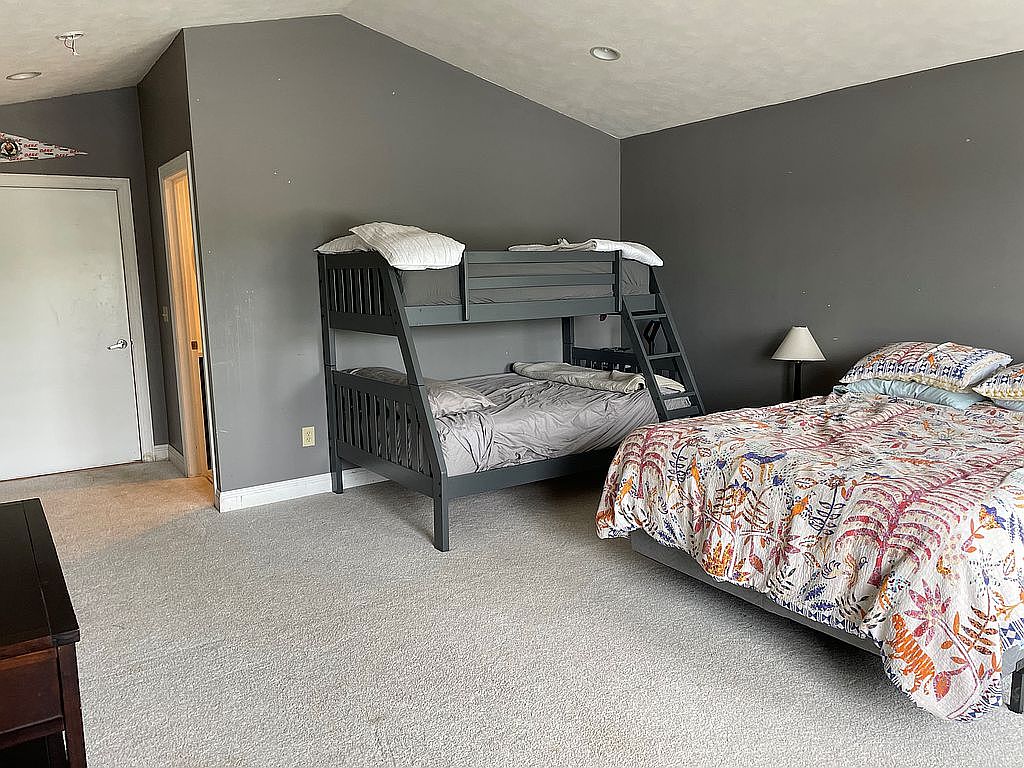 This bedroom features a high vaulted ceiling painted in a neutral gray tone, matching the surrounding walls, which creates a calm and cozy atmosphere. The carpeted floor is a light beige color, softening the overall look. On one side, there is a dark gray bunk bed with simple, clean lines that complements the wall color, fitted with muted bedding. Adjacent to it is a larger bed covered in a lively, colorful quilt with red, orange, blue, and white patterns. A small black nightstand and a white lampshade provide practical lighting. Doors lead to other rooms, enhancing the functional layout.
