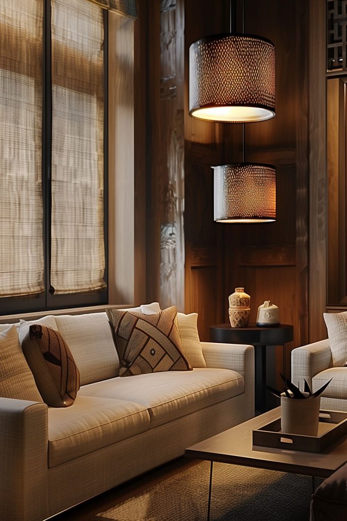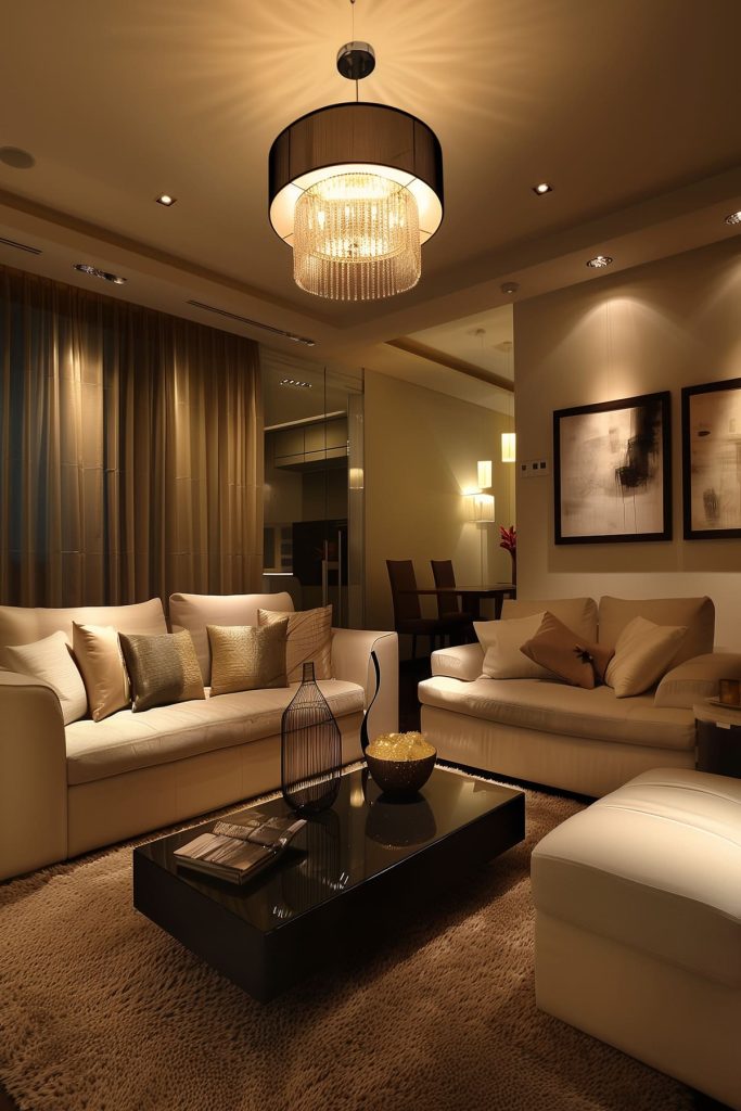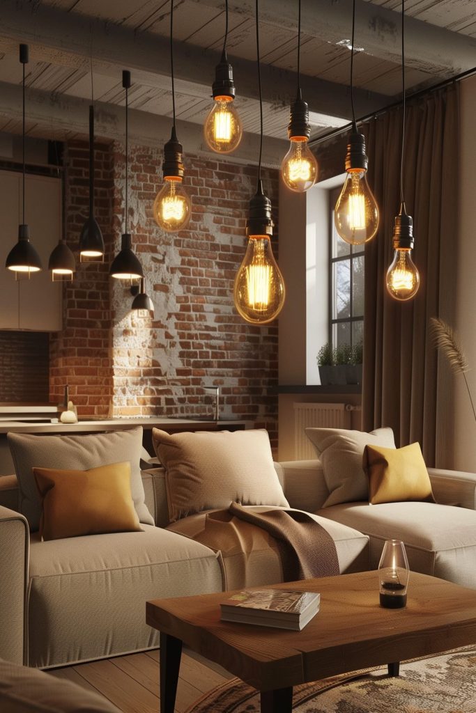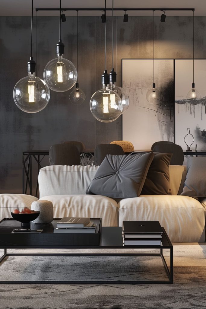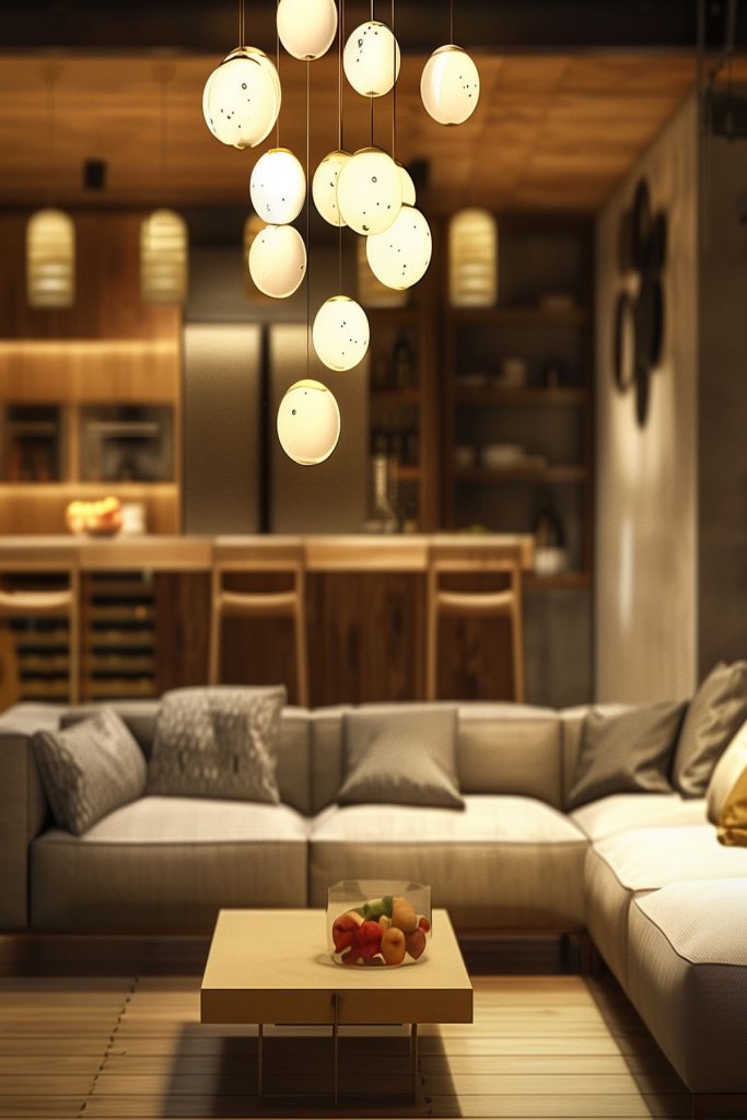 Hang pendant lights above key areas such as the coffee table or dining area to provide focused task lighting while enhancing visual appeal.