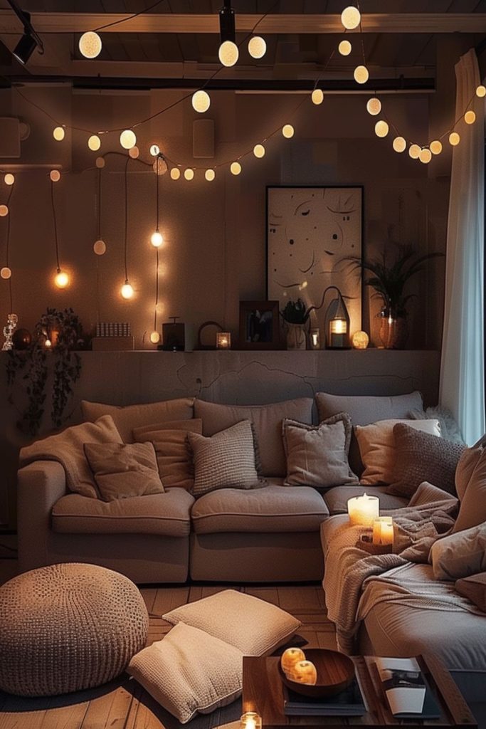 Hang globe or string lights to create a cozy and inviting atmosphere, perfect for entertaining or relaxing evenings at home.