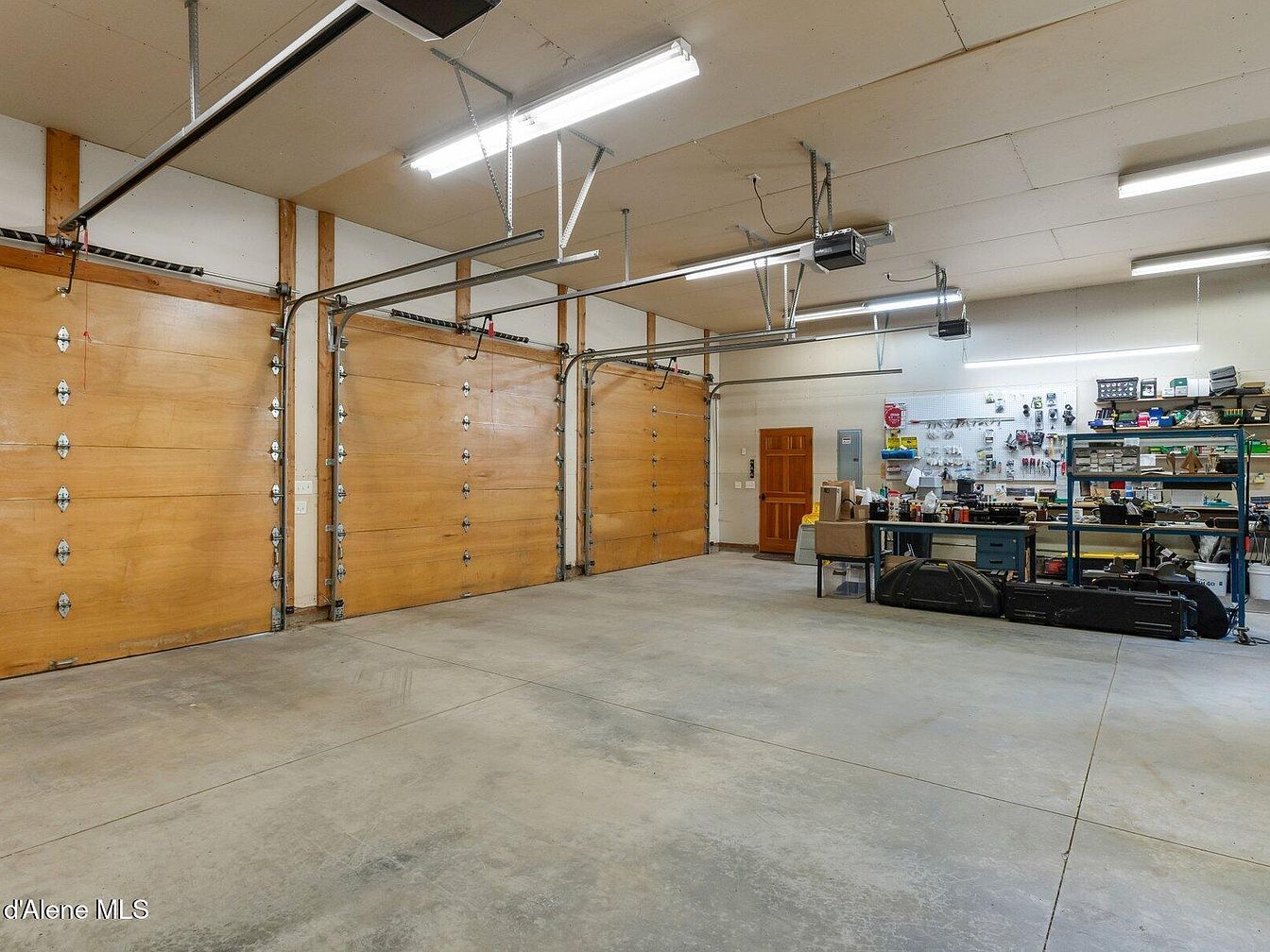 This large garage combines practical vehicle storage with a functional workshop area. Three wooden garage doors with metal hardware provide ample space for multiple vehicles or large equipment. The ceiling is equipped with bright fluorescent lighting, ensuring excellent visibility throughout the space. Toward the far wall, an organized workspace features pegboards with tools, shelving units stocked with supplies, and a sturdy workbench, highlighting the room’s utility. The flooring is finished in plain concrete, emphasizing durability. Neutral colors and exposed framing contribute to a clean, industrial aesthetic suited for both storage and DIY projects.