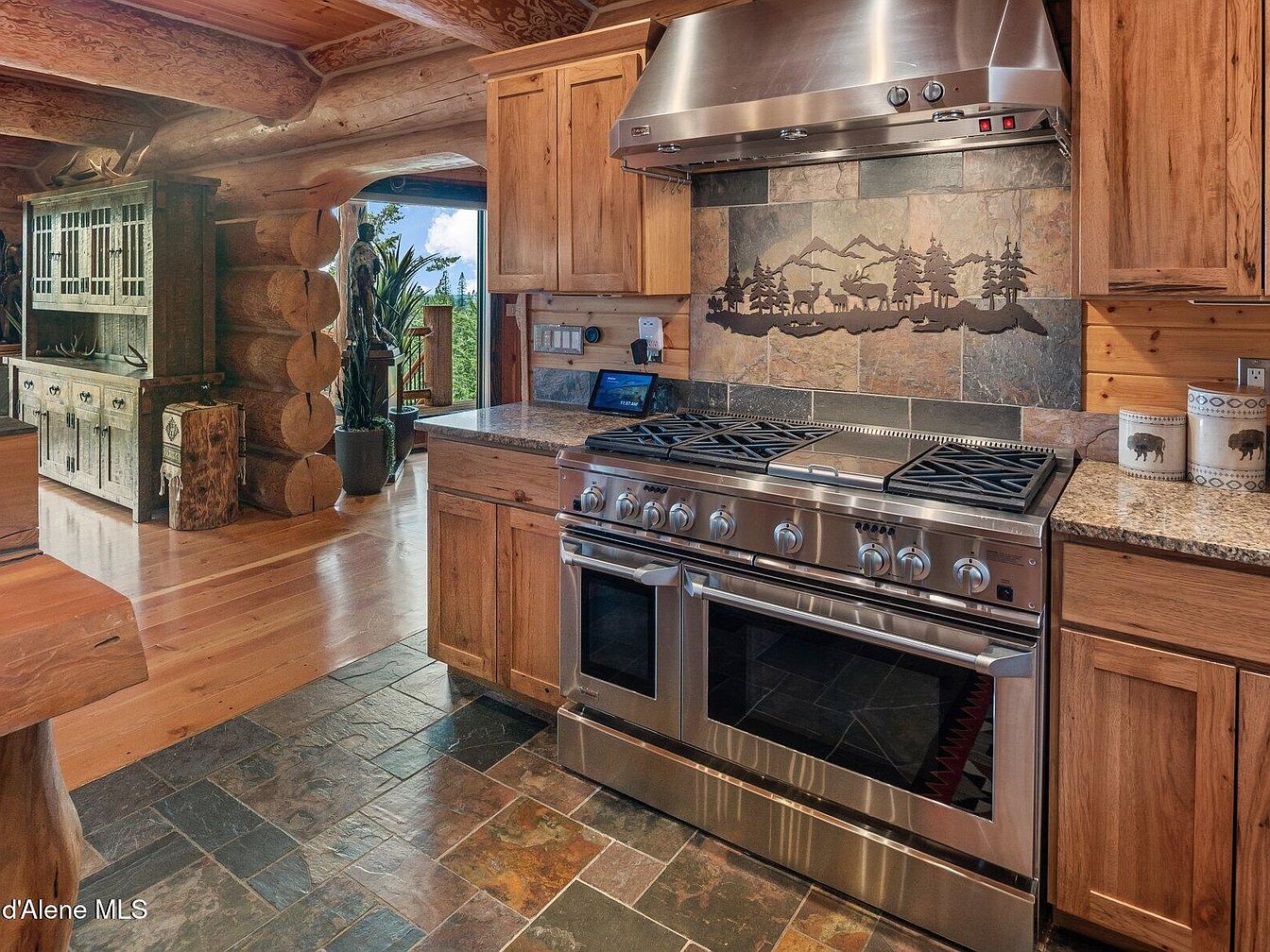 This kitchen area combines rustic charm with modern functionality. The cabinetry is crafted from natural wood, complementing the log beam architecture that highlights the room’s cozy, cabin-like feel. The stainless steel dual oven and stove offer high-end cooking options, set against a stone tile backsplash featuring a metal artwork of elk and pine trees, reinforcing the nature-inspired theme. The flooring is a mix of dark and earthy stone tiles, while granite countertops provide durability and contrast. This warm, inviting space elegantly bridges rugged natural elements with contemporary appliances and finishes.