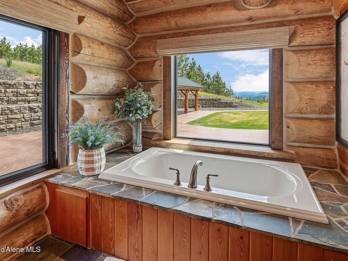 This cozy bathroom corner features a built-in soaking tub surrounded by rustic natural stone tiles and warm wooden paneling under the tub deck. The room boasts log cabin walls that add texture and a natural charm, creating a serene retreat feel. Large windows on two sides flood the space with natural light, offering expansive views of an outdoor patio, lush green lawn, and scenic rolling hills beyond. The neutral earth tones blend seamlessly with the natural wood, while potted green plants add a touch of freshness and softness to the robust, rugged aesthetic.