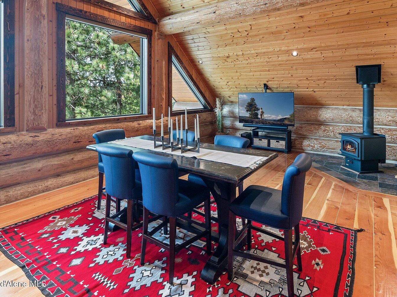 This cozy dining space features a rustic log cabin aesthetic with natural wood paneling on the walls and ceiling, creating a warm, inviting atmosphere. A dark wooden table seats six, paired with plush blue upholstered chairs that add a modern touch to the otherwise traditional setup. The striking red area rug underneath introduces bold geometric patterns, complementing the natural tones beautifully. Large triangular and rectangular windows offer ample natural light and scenic views of lush pine trees outside. A black wood-burning stove sits on a tiled hearth, adding both charm and functional warmth. A flat-screen TV and a subtle arrangement of pampas grass complete the space’s blend of comfort and contemporary living.