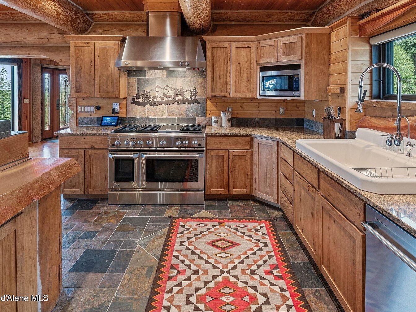 This kitchen reflects a cozy, rustic aesthetic with extensive use of natural wood, visible in the cabinetry and log beams overhead. The cabinetry has a warm, natural finish complementing the wood-paneled walls, creating a cabin-like feel. The counters are granite, offering durability and subtle elegance. A large farmhouse-style white sink sits beneath a window that lets in natural light and greenery views. The stainless steel stove and range hood provide a modern contrast, with a nature-themed tile backsplash depicting a forest scene behind the stove. The slate tile floor and geometric-patterned rug add texture and color, grounding the space with earthy tones and intricate design.