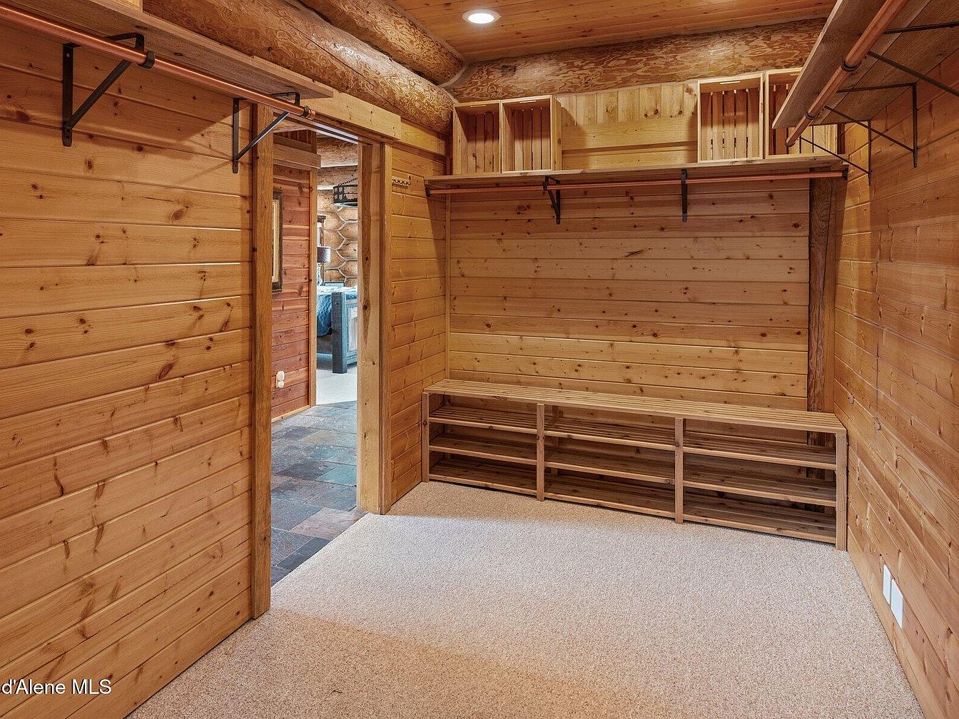 This cozy mudroom features natural wood paneling and log accents, lending a rustic cabin ambiance. The room includes multiple open shelves for storing shoes or outdoor gear above a long bench with cubbies beneath, providing practical seating and ample storage. The light natural wood tones contrast pleasantly with the neutral beige carpeting underfoot. A sturdy rod spans the upper walls on two sides, ideal for hanging coats or hats. Recessed ceiling lighting ensures the space is well illuminated. The adjacent floor’s dark slate tiles hint at a transition to other living areas, adding textural contrast.