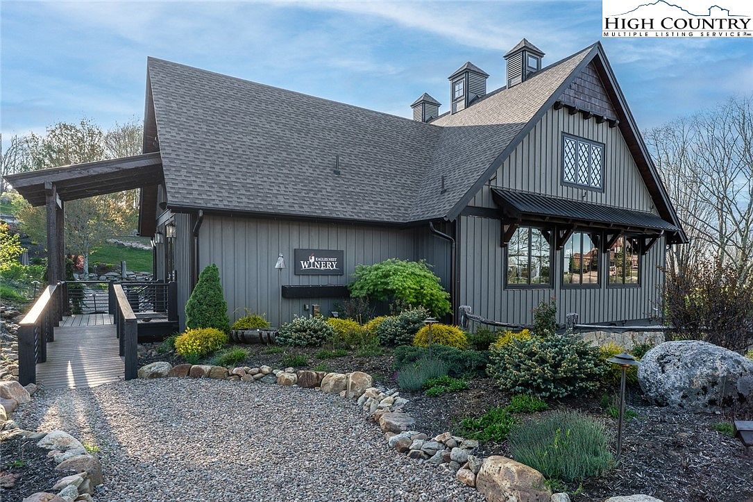 This charming winery exterior features a steep, dark gray shingled roof with multiple dormers and a blend of vertical wooden siding painted soft gray with black trim accents that highlight the rustic yet refined architectural style. A wooden ramp and railings provide accessible entry, bordered by lush, well-maintained landscaping with various shrubs, ornamental grasses, and a mix of large natural stones that frame the gravel driveway, creating a warm and inviting atmosphere. Large windows with diamond grid patterns add character, allowing plenty of natural light to brighten the inviting interior beyond.