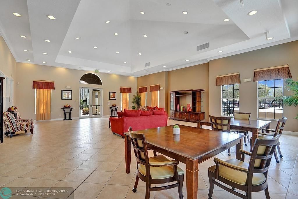 This spacious community lounge features a warm, neutral color palette with beige and taupe walls complemented by tiled floors in soft cream tones. The ceiling is adorned with recessed lighting and a tray design that enhances the room’s volume and brightness. Multiple windows with tailored valances provide ample natural light and outdoor views. Comfortable seating includes a striking red sofa and a patterned armchair, balanced by classic wooden tables and chairs arranged for social interaction or casual meetings. Decorative accents, such as small plants and vases, add subtle color and texture, creating a welcoming, well-appointed communal space.