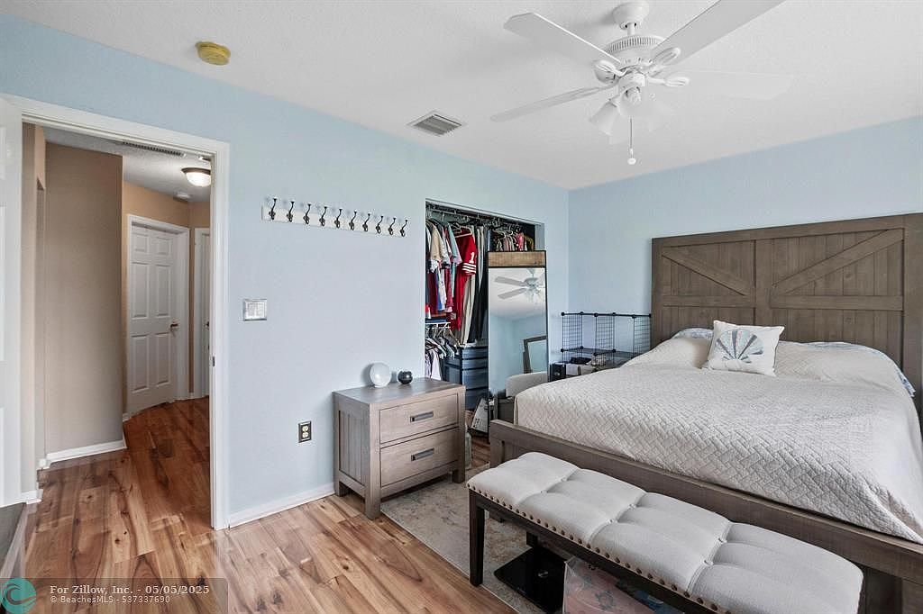 This cozy master bedroom features light blue walls contrasted with warm wood flooring, creating a calm and inviting atmosphere. A large wooden bed with a panel headboard is dressed in a neutral quilted bedspread, complemented by a small decorative pillow. At the foot of the bed sits a cushioned bench with a tufted, light fabric seat and dark wooden legs, offering extra seating and storage space beneath. To the left, a small wooden nightstand with two drawers holds simple decor pieces. The open closet reveals organized hanging clothes and a full-length mirror, with a ceiling fan overhead providing comfort and air circulation.