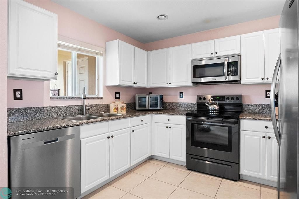 This kitchen features a clean, modern design with light pink walls that add subtle warmth. White cabinetry with simple round knobs lines the walls, providing ample storage both above and below the granite countertops, which extend into a practical L-shape. Stainless steel appliances — including a dishwasher, oven with stovetop, microwave, and refrigerator — enhance the sleek look. The double basin sink sits beneath a sizable window, inviting natural light. Beige tiled flooring completes the neutral palette, creating a bright and inviting space for cooking and meal prep.