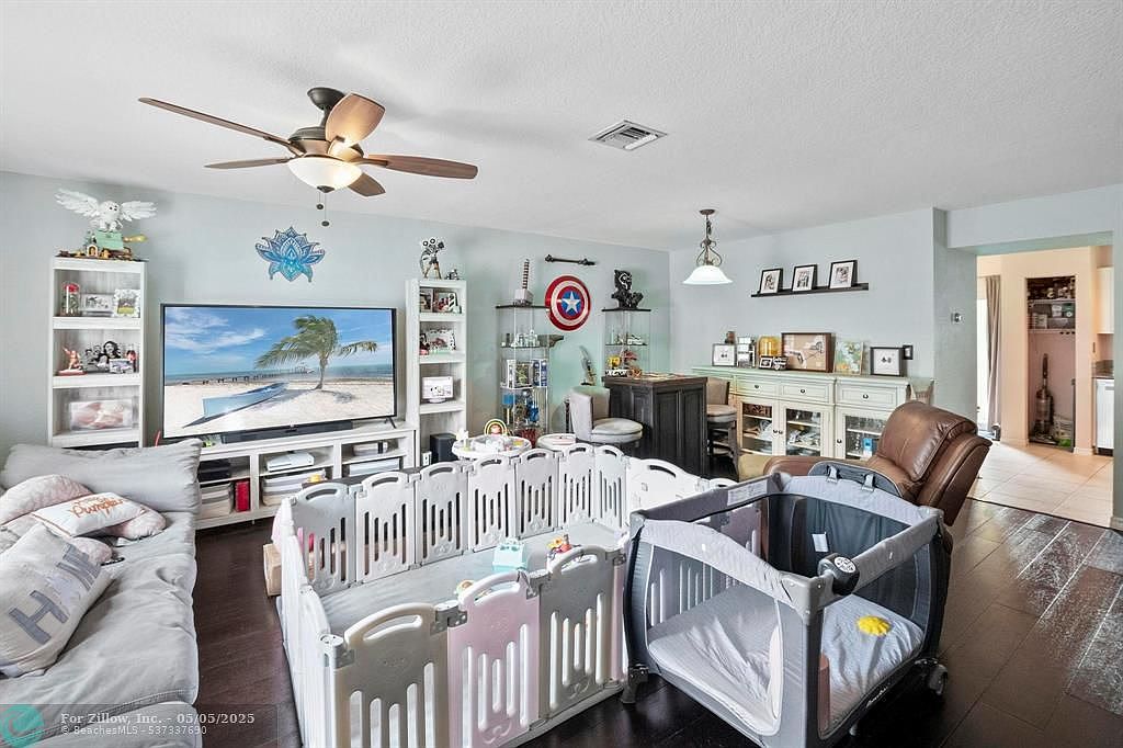 This inviting living room combines comfort with functionality, highlighted by soft pastel blue walls that enhance natural light. A spacious gray sectional sofa anchors the space, dotted with cozy pillows, while a modern ceiling fan with warm lighting hangs overhead. The entertainment center features a large TV flanked by matching white shelving units filled with decor and collectibles. The focal point includes a sizable white baby playpen and a smaller gray play yard, showing a family-friendly layout. Dark hardwood floors contrast beautifully with the light walls and white cabinetry along the back wall, adding warmth. Artistic touches such as framed photos, action figures, and a colorful Captain America shield bring character and personality to this well-organized, lived-in family hub.