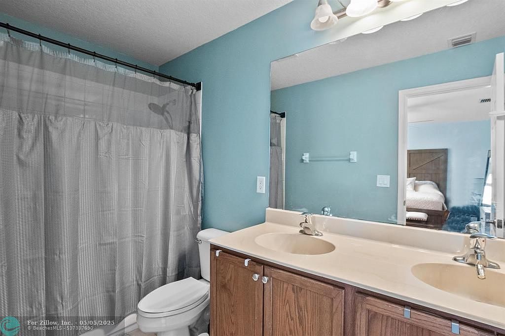 This bathroom features a functional layout with a double sink vanity made of light beige solid surface countertop and warm wood cabinetry beneath, providing ample storage. The walls are painted a calming seafoam blue, which complements the white fixtures and creates a fresh and airy atmosphere. A large, frameless mirror stretches across the wall above the sinks, reflecting natural light and visually expanding the space. The shower and tub combo is enclosed with a neutral gray shower curtain, and a white toilet sits neatly beside the vanity. Clean lines and practical elements highlight this comfortable and simple bathroom design, while the visible bedroom doorway hints at easy bedroom-bathroom access.