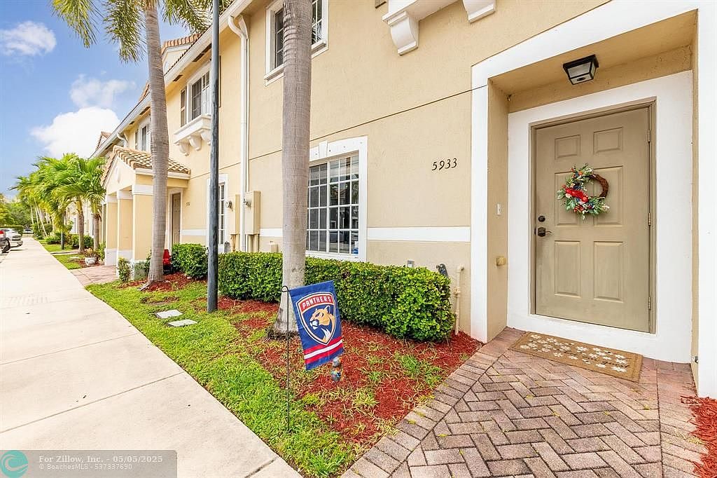 This inviting front entrance features a beige door with a charming holiday wreath, framed by a small recessed porch area. The walkway consists of neatly laid pavers that contrast with the surrounding red mulch beds, adding warmth and texture. Landscaping includes well-maintained green bushes and tall palm trees that line the smooth concrete sidewalk, reinforcing the home’s tropical ambiance. The exterior walls are painted in soft tan with white trim accents, offering a clean, fresh look. The house number “5933” is prominently displayed, enhancing the home’s welcoming curb appeal.