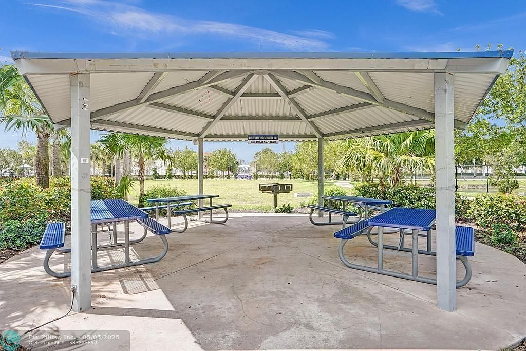 This outdoor pavilion provides a spacious, shaded area perfect for gatherings and picnics. It features a metal roof with a peaked design supported by sturdy posts, painted in light tones that complement the natural surroundings. Underneath, there are four blue metal picnic tables with matching benches, arranged symmetrically around the perimeter. The concrete floor offers durability and easy maintenance, while the surrounding greenery, including palm trees and manicured bushes, adds a tropical and inviting atmosphere. The open layout allows for ample airflow and unobstructed views of the lawn and distant trees, enhancing the relaxed, communal vibe of this outdoor space.
