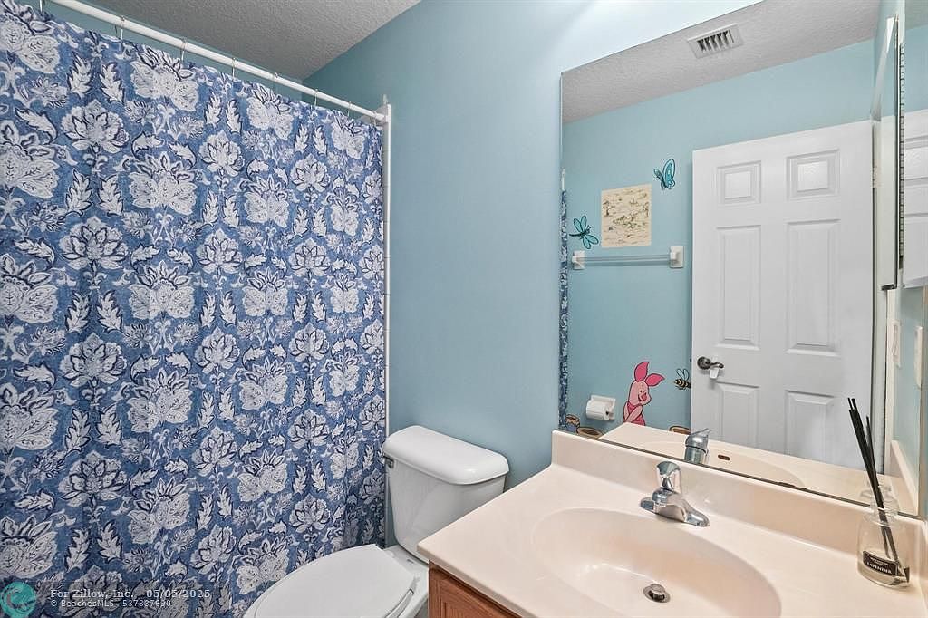 This cozy bathroom features a soothing pastel blue color scheme on the walls, creating a calm and inviting atmosphere. The white toilet and off-white countertop with a built-in sink provide a clean, classic look. A large mirror above the sink visually expands the space and reflects light. The blue and white floral-patterned shower curtain adds a touch of elegance and coordinates with the wall color. Simple decorative elements, like butterfly and cartoon character wall decals, add a playful and personalized touch, making this space feel warm and homey.