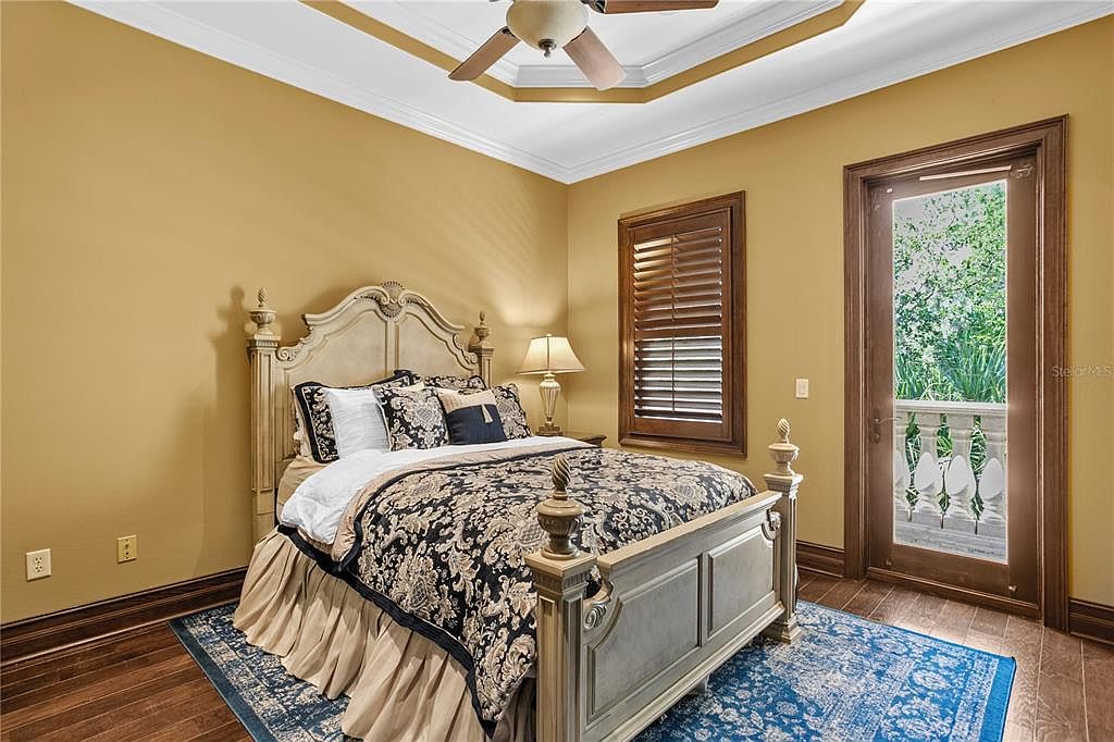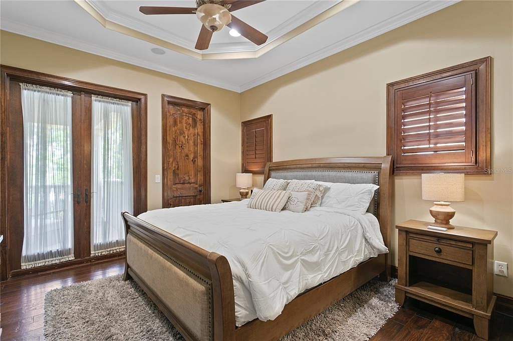 This master bedroom offers a luxurious and elegant atmosphere, featuring a grand tufted bed with detailed carvings and a matching ornate nightstand in a metallic finish. The room is spacious with warm wood flooring and a large, patterned area rug anchoring the space. Walls are painted a soothing gray, complementing the rich wood crown molding and trim around the ceiling and windows. Floor-to-ceiling drapes in cream fabric frame expansive windows and French doors, creating a seamless connection to the outdoors. A ceiling fan adds a practical touch while maintaining classic style and comfort.