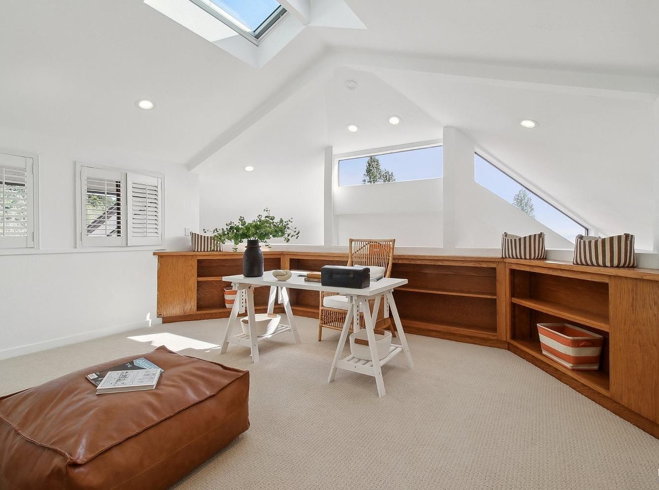 This serene attic workspace features a bright white vaulted ceiling with recessed lighting and a skylight that floods the room with natural light. The space is anchored by a modern white trestle desk paired with a woven wooden chair, creating an inviting spot for productivity. Running along one wall, built-in wooden shelves and cabinets provide ample storage and display space, with striped cushions adding a cozy touch to the seating area integrated into the cabinetry. Neutral carpeting softens the room while a large brown leather pouf offers casual seating and a spot for relaxation or reading. The angular window adds architectural interest and frames serene views of the outdoors, completing the airy, minimalist aesthetic.