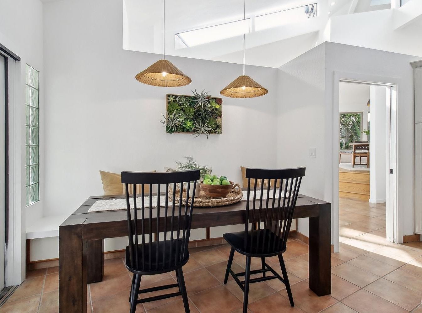 This dining nook features a strong contrast between the dark wood table and black spindle-back chairs against soft white walls and natural terracotta tile flooring. Two pendant lights with woven rattan shades hang from a high ceiling with clerestory windows, allowing natural light to flood the space. A built-in bench with neutral beige cushions lines one wall, providing cozy seating. A framed green succulent wall art adds a touch of nature and color. The open doorway leads to another room with light wood stairs, emphasizing an airy, clean, and relaxed aesthetic throughout.