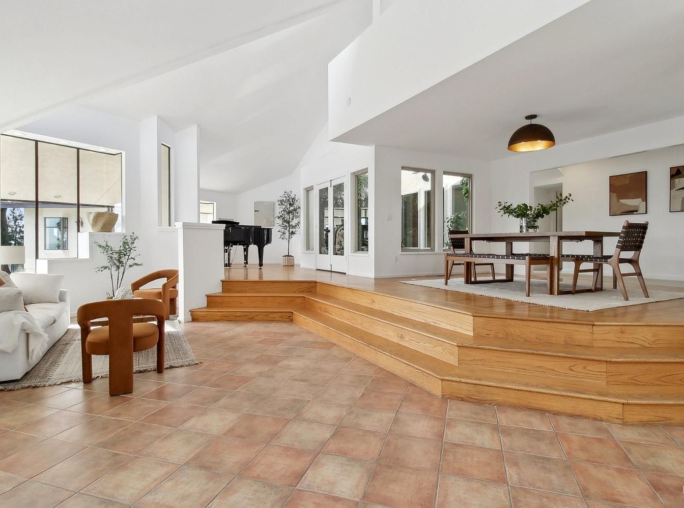 This open-plan space features a terracotta-tiled floor that transitions into a raised wooden platform, defining the dining area. The dining area is furnished with a modern wooden table and matching chairs with woven backs, set on a neutral rug. Above it hangs a large, black dome-shaped pendant light adding a sculptural element. The living area is cozy with white upholstery and soft cushions, complemented by two warm-toned accent chairs that contrast beautifully with the overall light and airy feel. Large windows and multiple glass doors bring in natural light, highlighting the minimalist white walls and vaulted ceilings. A grand piano sits in the background, adding an elegant touch. The space is accented with greenery and modern art, balancing warmth and simplicity.