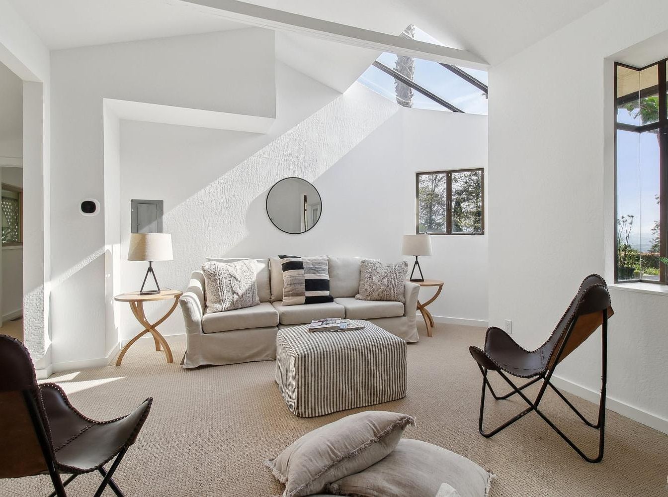 This serene sitting area features a neutral color palette dominated by soft whites and beige tones, creating a calm atmosphere. The space centers around a plush beige sofa adorned with textured throw pillows, paired with an ottoman covered in subtle striped fabric, adding gentle pattern contrast. Flanking the sofa are two elegant wooden side tables with matching lamps, contributing warmth and symmetry. The room is accentuated by modern, sculptural butterfly chairs in dark leather and metal frames. Natural light floods in through multiple windows and a unique skylight, highlighting the high vaulted ceiling and bright, airy vibe.