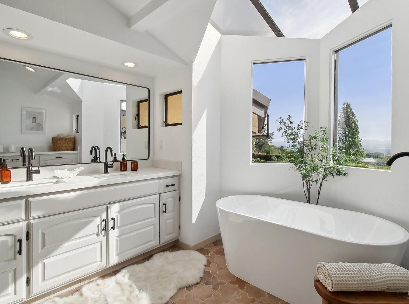 This bathroom highlights a serene, spa-inspired ambiance with a sleek freestanding tub positioned near floor-to-ceiling windows that frame lush greenery and an expansive outdoor view. The abundant natural light complements the crisp white walls and cabinetry, accented by matte black fixtures that add modern contrast. A large rectangular mirror above a dual-sink vanity enhances the spacious feel, while warm terracotta hexagonal floor tiles and a plush white rug introduce texture and warmth. Minimalist décor, such as amber glass containers and a small green plant, completes the tranquil and inviting setting.