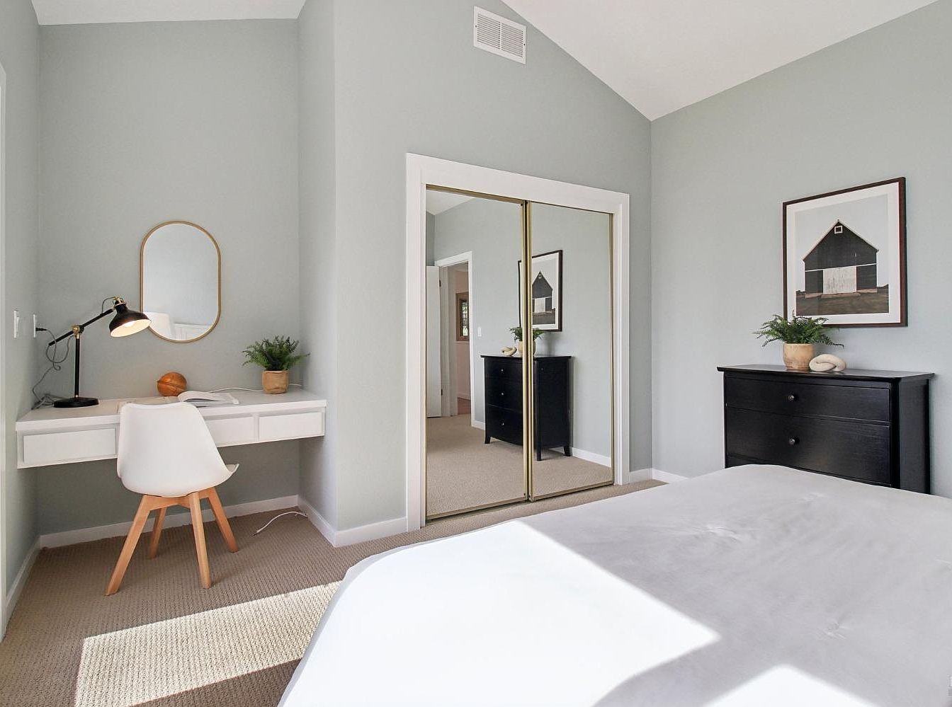 This charming bedroom corner combines functionality with simplicity, featuring soft sage green walls that complement the beige carpet flooring. A built-in white floating desk, paired with a modern white chair with wooden legs, creates a cozy workspace illuminated by a classic black adjustable desk lamp. Above the desk, an oval mirror framed in light wood adds visual interest and reflects natural light. Opposite the workspace, mirrored sliding closet doors enhance the room’s spacious feel. A sleek black dresser accented with a potted plant and minimalist barn-themed artwork introduces subtle contrast and rustic charm.
