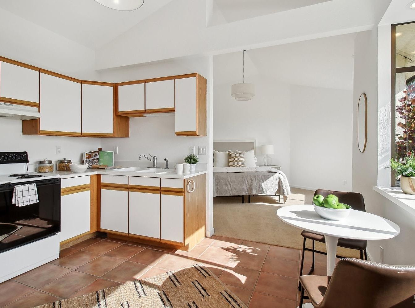 This cozy kitchen features a warm yet neutral color palette with white cabinets framed by natural wood accents. The terracotta tile floor adds an earthy tone that complements the cabinetry. A black electric stove contrasts subtly with the lighter cabinetry. Adjacent to the kitchen is a small dining nook with a round white pedestal table and brown leather chairs, placed by a large window that allows natural light to flood the area. Beyond a half wall, a bright bedroom space with light carpeting and soft neutral bedding completes this open and inviting layout.