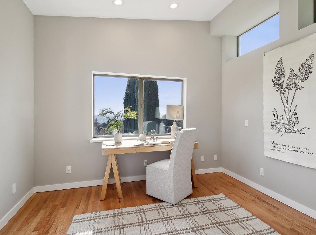 This serene home office nook features clean lines and a minimalist design, promoting focus and calm. A natural wood desk stands against the wall beneath a large window that brings in ample natural light and offers a view of tall trees outside. The room’s walls are painted a soft, neutral beige, complementing the light hardwood floors. A plush, light gray upholstered chair provides comfortable seating. Above, a high, narrow window adds architectural interest and extra daylight. A botanical wall hanging with a motivational quote enhances the tranquil and inspiring ambiance. A plaid area rug anchors the space with subtle texture and warmth.