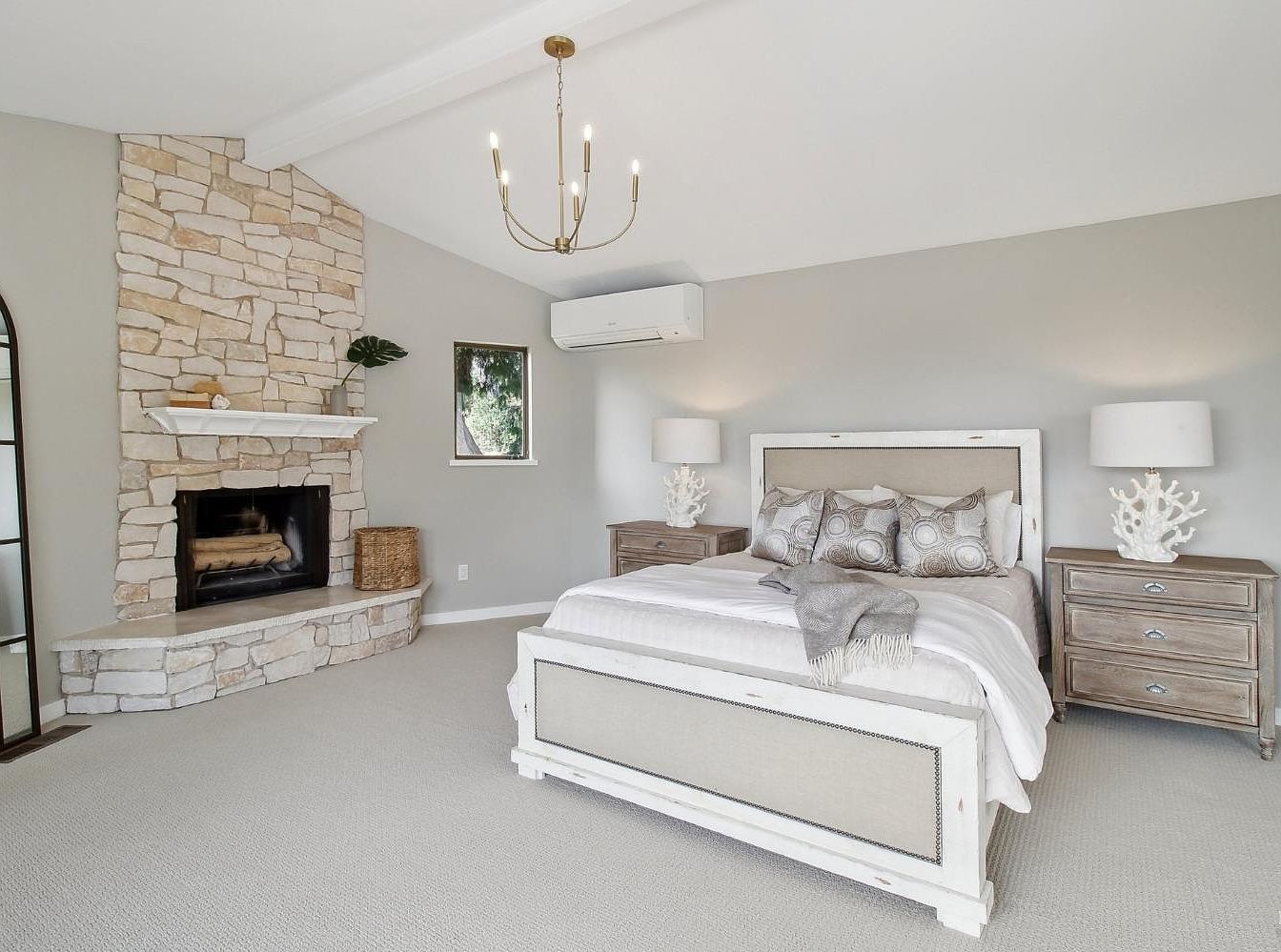 Neutral tones define this tranquil bedroom space, highlighted by a stone fireplace in the corner that adds rustic charm. The room feels airy with soft gray walls and light carpeting underfoot. A white-framed bed with an upholstered headboard sits centrally, flanked by two wooden nightstands featuring distinctive coral-inspired lamps. Above, a minimalist brass chandelier hangs from a vaulted ceiling, contributing a modern touch. A small window lets in natural light, while the air conditioning unit ensures comfort. The decor strikes a balanced mix of cozy warmth and understated elegance, perfect for restful evenings.