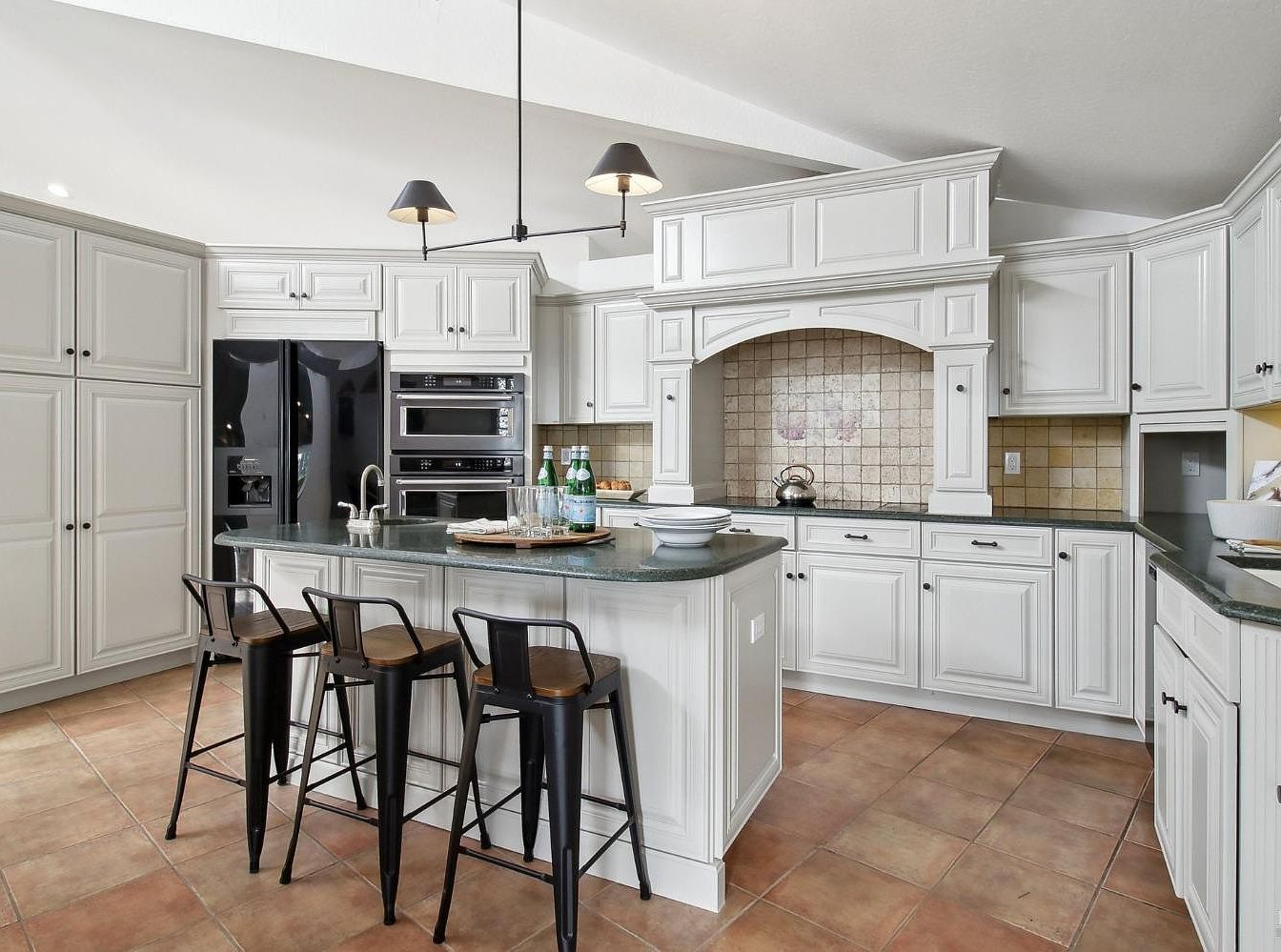 This kitchen exudes a classic yet functional charm with its comprehensive use of white cabinetry that offers ample storage and a cohesive look. The large kitchen island is topped with a dark countertop that contrasts beautifully against the white base, also serving as a breakfast bar with three sleek black metal stools featuring wood seats. The backsplash behind the stove area features warm, neutral tiles with subtle decorative detailing, framed by an ornate hood enclosure. Stainless steel appliances, including a double oven and a black refrigerator, blend smoothly into the layout. Earth-toned floor tiles add warmth while complementing the overall neutral and clean color palette. Contemporary black pendant lighting above the island adds an industrial edge to the traditional space.