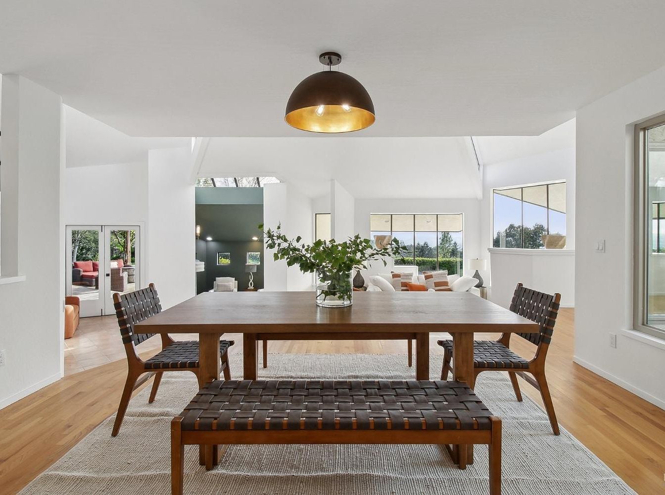 This dining area features a clean, modern design with an open layout connecting to the living space beyond. Natural light floods the room through large windows, enhancing the serene white walls and light wood flooring. A rectangular wooden table anchors the space, accompanied by two matching woven leather chairs and a bench, adding texture and warmth. A neutral woven rug defines the dining zone. Above, a dome-shaped pendant light with a metallic gold interior offers a subtle, stylish contrast. The overall aesthetic balances organic materials and minimalist lines, fostering an inviting, airy atmosphere.