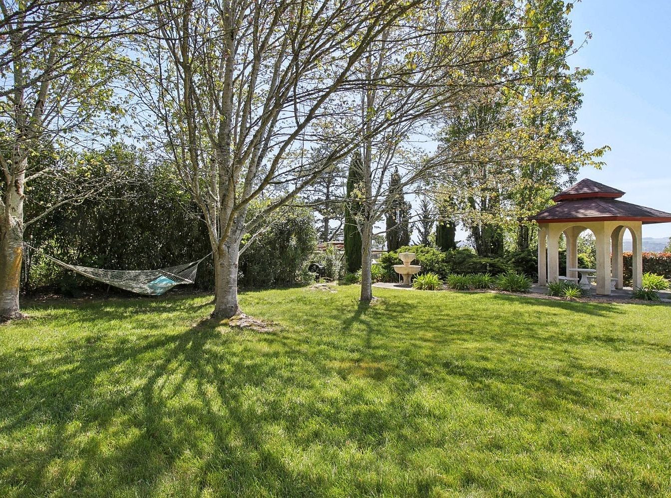 This serene backyard features a lush, well-maintained lawn framed by mature trees that cast gentle shadows, enhancing the tranquil atmosphere. A woven hammock, with a light blue pillow, stretches invitingly between two trees, offering a cozy spot for relaxation. On the right, a charming gazebo with a dark red roof and cream-colored pillars provides a shaded seating area, complementing the garden’s peaceful ambiance. Nearby, a decorative tiered water fountain is surrounded by neat shrubbery and small plants, adding a sense of natural elegance and calm. The overall design balances open green space with thoughtful, nature-inspired elements.