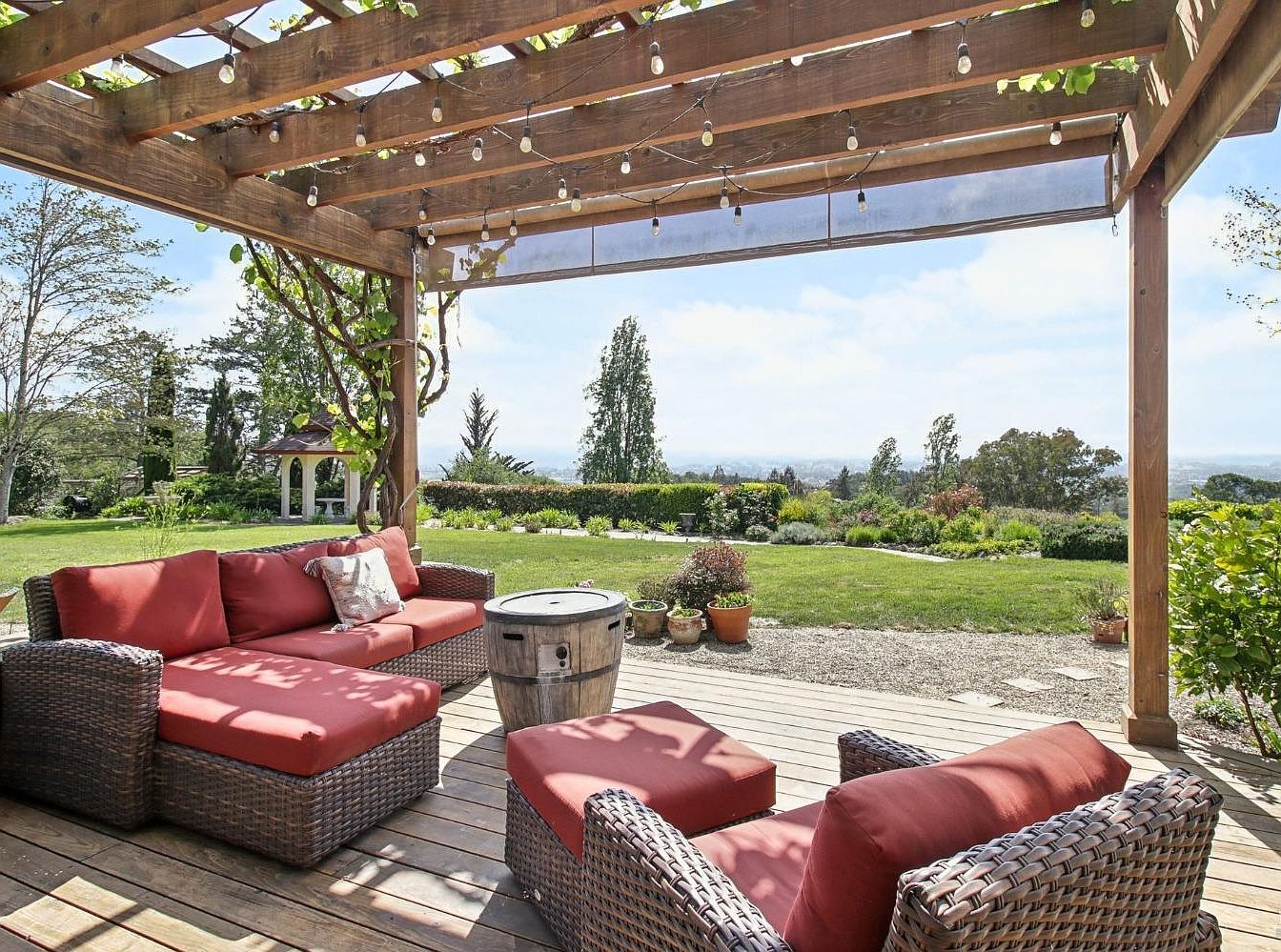 This inviting outdoor patio features a sturdy wooden pergola adorned with string lights that add charm and ambiance. Below, a set of woven rattan furniture with deep red cushions creates a cozy and comfortable seating area. The sectional sofa, armchair, and ottoman are arranged around a rustic barrel-style side table, perfect for casual gatherings. The deck’s natural wood flooring complements the earthy tones of the furniture. Beyond, a lush green lawn and well-manicured garden beds stretch out to reveal a scenic view, framed by diverse trees and shrubbery, evoking a peaceful and relaxing retreat.