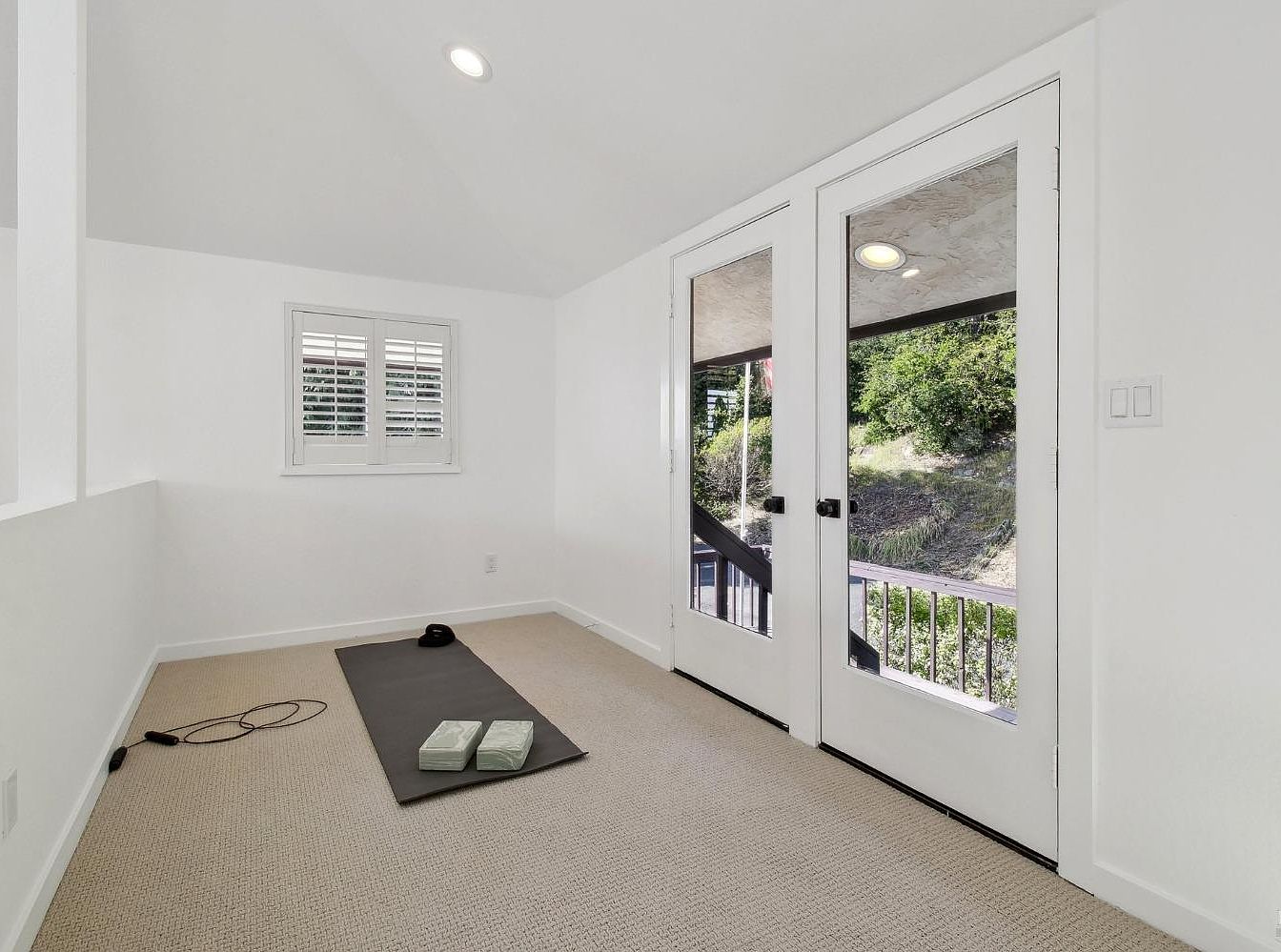 This compact exercise nook is defined by a serene, minimalist aesthetic featuring crisp white walls and a neutral beige carpet. It is well-lit through a double glass door that opens to an exterior railing and greenery beyond, creating a refreshing indoor-outdoor connection. A small window with classic white shutters adds charm and ventilation to the space. The layout is simple and functional with a yoga mat, blocks, and a jump rope suggesting a dedicated area for personal fitness or mindfulness practice, enhancing the home’s overall wellness vibe.