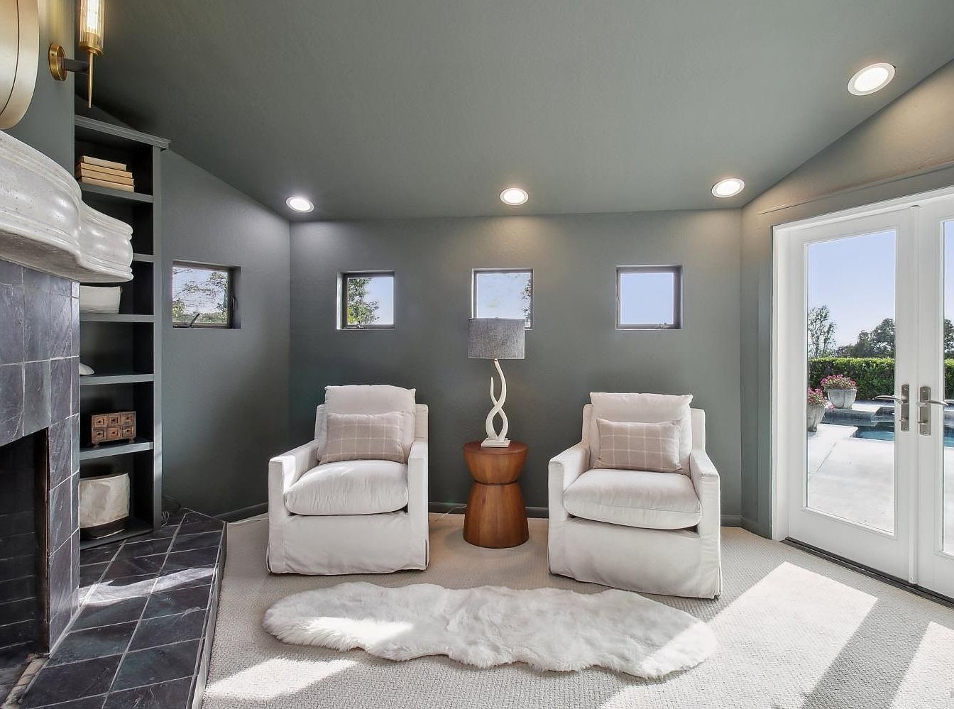 This intimate sitting area features a soothing muted gray-green color palette that envelops the walls and ceiling, creating a calming atmosphere. Two plush, ivory slipcovered armchairs with light checkered throw pillows face each other, separated by a sculptural wooden side table topped with a contemporary lamp. The arrangement rests on a light beige carpet layered with a soft, white faux fur rug enhancing the cozy appeal. Three small square windows punctuate the back wall, inviting natural light while maintaining privacy. To the right, French doors open to an outdoor pool area, seamlessly blending indoor and outdoor living. On the left, a tiled black fireplace and built-in shelves complete this tranquil nook designed for relaxation and quiet conversation.