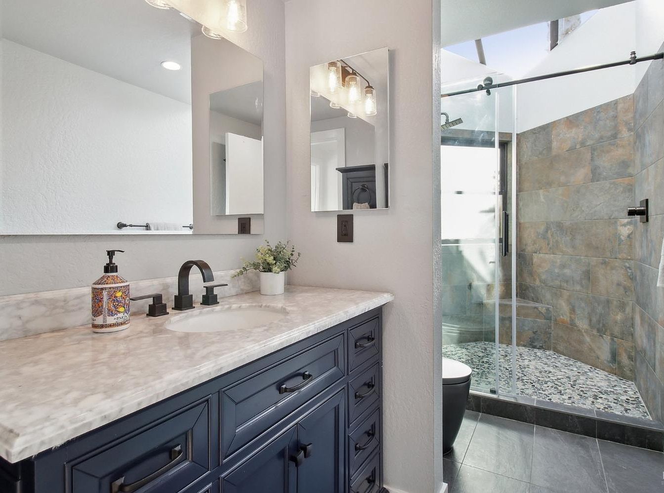This bathroom features a sleek vanity with a dark navy cabinet, contrasted by a smooth, light marble countertop that adds elegance. The black modern faucet and drawer handles provide a cohesive look. Two rectangular mirrors with simple frames hang above, illuminated by classic industrial-style lighting fixtures. Adjacent to the vanity is a walk-in shower enclosed with frameless glass doors, highlighting natural stone tiles in earthy gray and beige tones. The pebble-style shower floor adds texture and interest, combining modern functionality with a natural aesthetic. The space balances clean lines and organic materials beautifully.