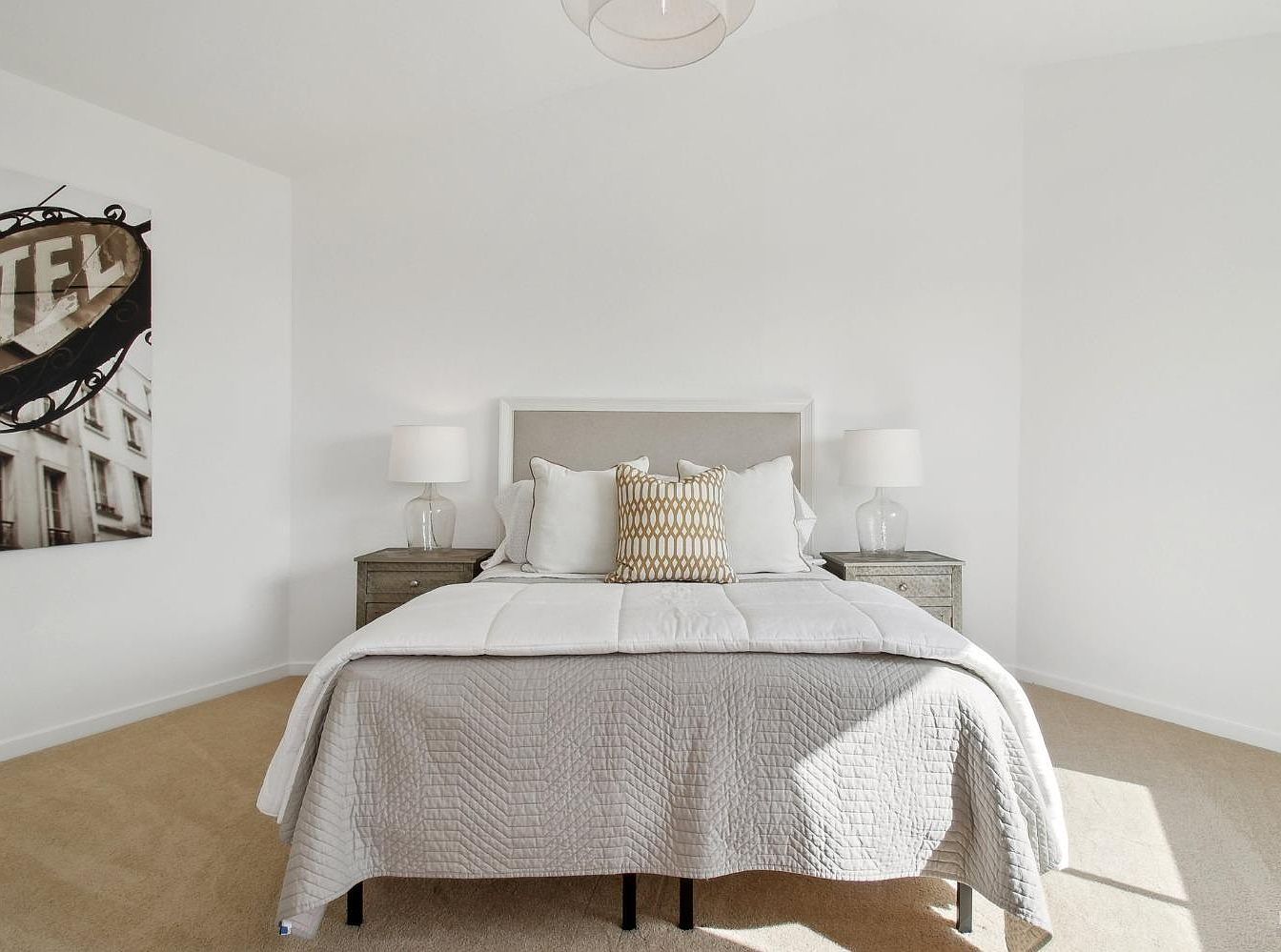 This serene master bedroom features a minimalist design with a neutral color scheme dominated by soft whites and subtle grays. The bed is centered against a white wall, showcasing a light gray upholstered headboard framed in white. Crisp white bedding is layered with a textured gray quilt, complemented by multiple pillows including a patterned accent cushion in beige tones. Matching bedside tables in a distressed wood finish hold clear glass lamps with white shades, adding symmetry to the space. Plush beige carpeting covers the floor, while natural light floods the room, enhancing its airy and tranquil atmosphere. A black and white photograph leaning against the far wall adds a touch of urban charm to the otherwise calming space.