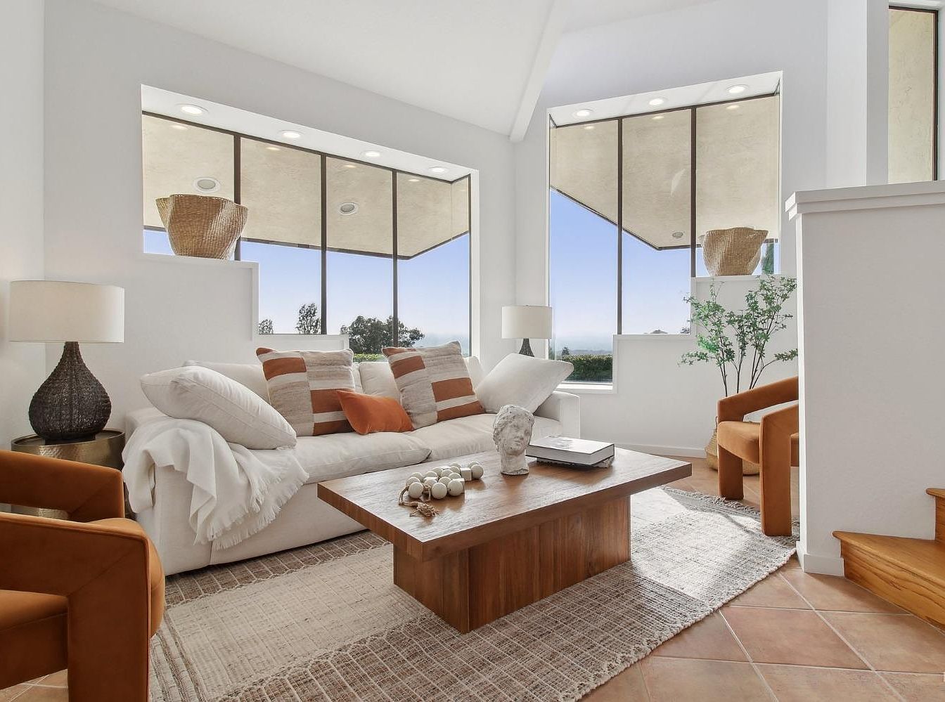 This sun-drenched living room features large floor-to-ceiling windows that flood the space with natural light and offer serene views of the outdoors. The neutral white walls and ceiling create an airy atmosphere, complemented by soft, earth-toned furnishings. A plush white sofa adorned with striped and solid rust-colored pillows anchors the room, paired with two rust-orange armchairs that provide warmth and inviting contrast. A wide, flat wooden coffee table sits centrally on a textured, woven beige rug, displaying simple sculptural décor and books. Minimalistic table lamps with dark bases and white shades flank the sofa, while natural elements such as a tall plant and wicker basket add subtle organic touches. The tiled floor and open layout enhance the feeling of spaciousness and comfort.