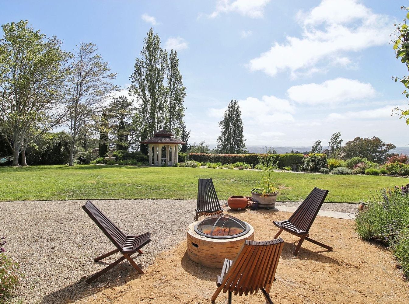 This inviting outdoor space centers around a circular stone fire pit, bordered by four modern wooden lounge chairs arranged for intimate conversation. The fire pit sits on a sandy patch that contrasts gently with the surrounding gravel, creating a natural yet organized setting. Beyond this cozy seating area, a lush, expansive lawn stretches toward a classic gazebo with elegant columns and a peaked roof, providing a charming focal point. Tall trees and well-groomed bushes frame the scene, while the bright blue sky and distant hills add to the tranquil, open-air ambiance.
