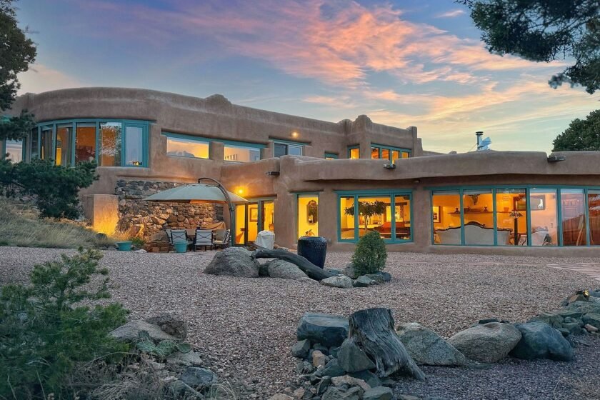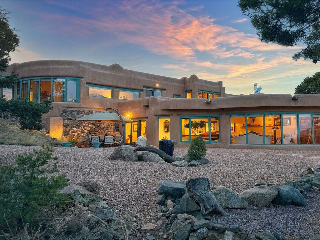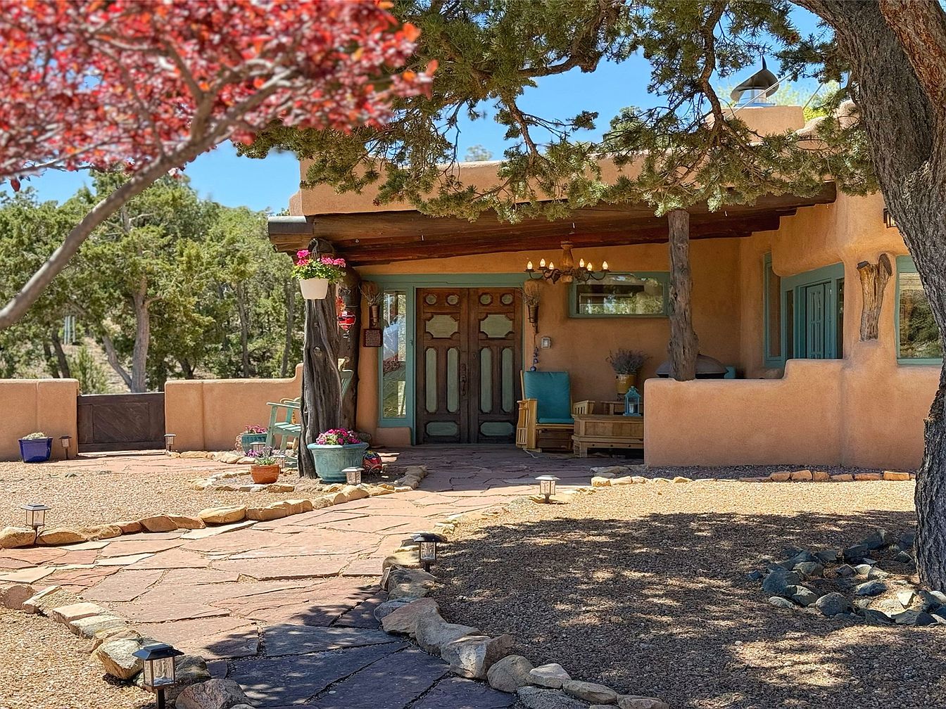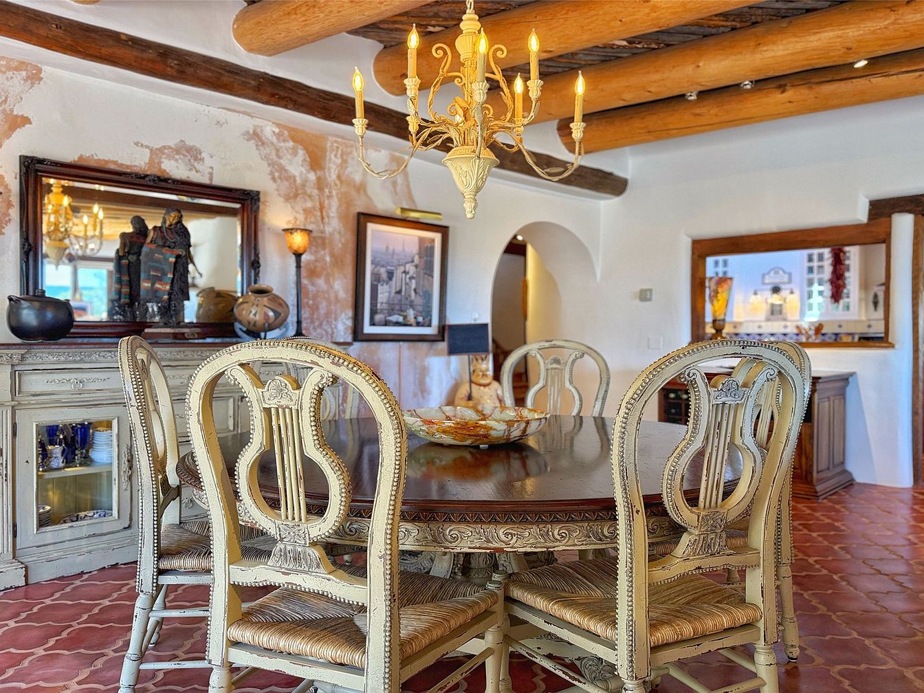This stunning property is a rare secret gem showcasing a storybook architectural style deeply influenced by Southwest and Spanish design elements, evident in its rounded adobe walls and the presence of traditional vigas. Located at 8 Hampton Road in Santa Fe, New Mexico, it offers expansive panoramic views of the surrounding Rowe mesa, Apache Ridge, and the majestic Sangre de Cristo mountains, all just 11 miles from the historic Santa Fe plaza. Priced at $2,300,000, this home exemplifies luxury and comfort with its exceptional craftsmanship visible throughout. The residence features a kitchen adorned with rich cherry wood cabinetry that flows seamlessly into a spacious dining room, ideal for entertaining. The living room is highlighted by a large, inviting wood-burning kiva fireplace, surrounded by floors of Saltillo tiles, hardwood, and brick that create a warm, welcoming ambiance. Natural light floods the interior through skylights and panoramic windows, complementing the artistic architectural details including a grand walnut staircase. The primary suite is a luxurious retreat complete with an adjoining sitting room, a cedar-lined closet, and a large jetted soaking tub, all framed by breathtaking sunrise views visible from a private patio. The exterior portals welcome guests with refreshing mountain breezes and meticulous landscaping. A charming and whimsical small retreat space is nestled down the hill, perfect for relaxation, creativity, or quiet contemplation while enjoying the mesmerizing vistas. While no specific year of construction or recent renovations were detailed, the impeccable condition and quality of the materials used strongly suggest ongoing attentive care and preservation of this architectural treasure.