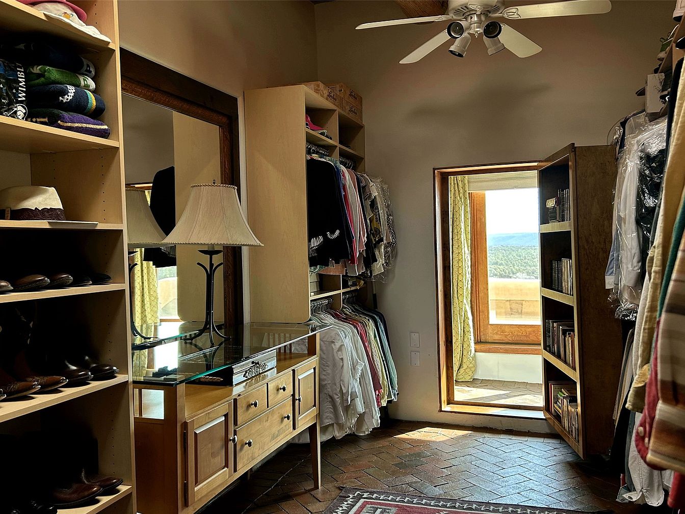 This walk-in closet exudes a warm, inviting atmosphere with soft beige walls and natural wooden tones dominating the space. The flooring is crafted from rustic terracotta tiles arranged in a herringbone pattern, adding texture and depth beneath a delicately patterned area rug. Built-in shelves display neatly organized shoes and folded clothing, while a wooden dresser topped with glass and adorned by a classic lampshade stands beside a large, framed mirror enhancing light and space. Clothing rods showcase a mix of garments, and a small doorway leads to a balcony, offering a scenic view and natural light that brightens the room.