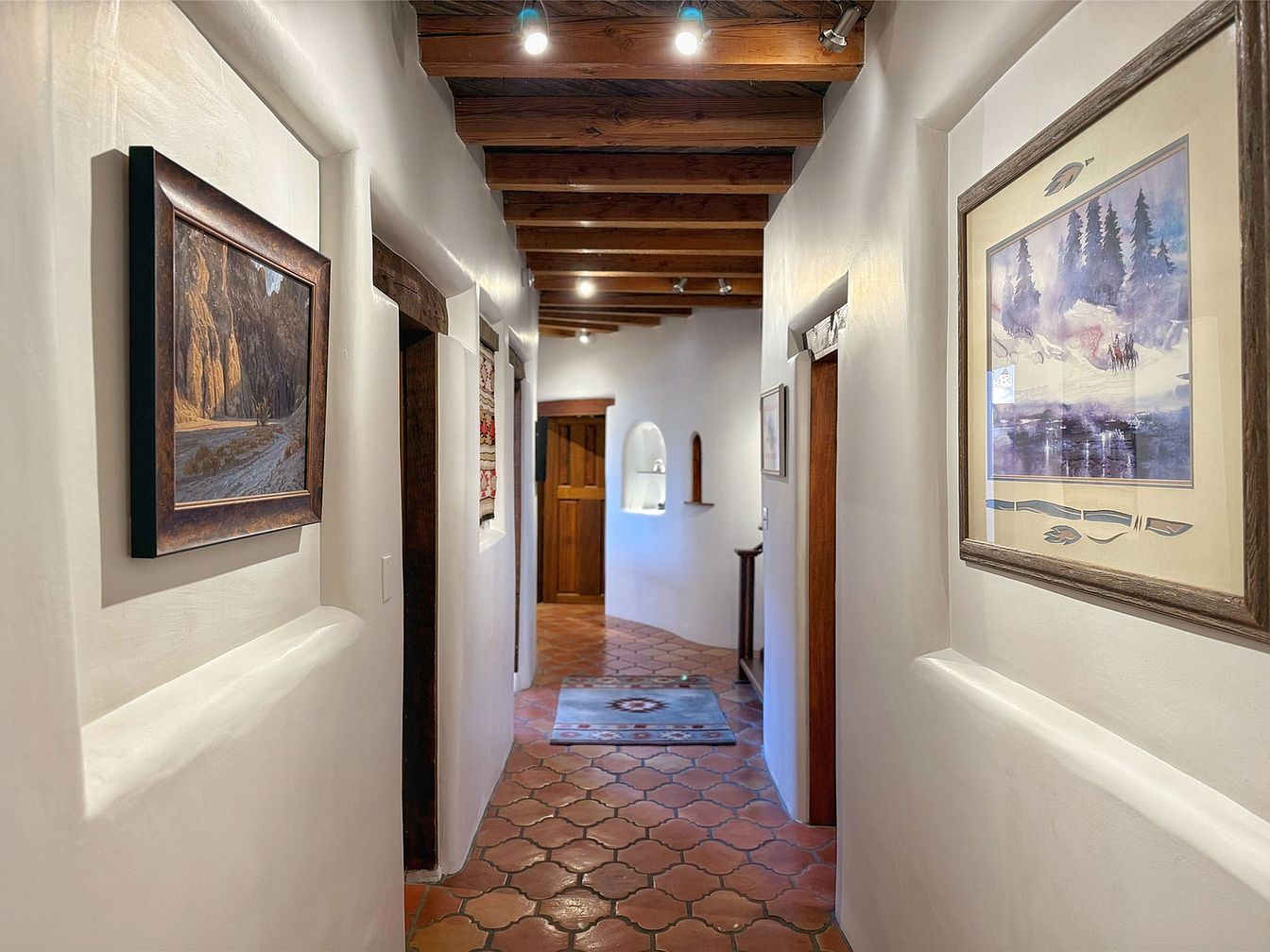 This inviting hallway features a combination of rustic and Southwestern design elements. The terracotta floor tiles in a patterned layout complement the warm wooden beams exposed on the ceiling, adding architectural interest. Smooth white plaster walls frame the corridor, with small built-in niches showcasing decorative objects, enhancing the room’s cultural charm. Several natural wood-trimmed doorways lead off the hallway, adding cohesive continuity. Artwork with nature and landscape themes hangs in recessed wall spaces, introducing color and texture to the space. Ambient ceiling lighting ensures a warm, welcoming atmosphere throughout the passage.
