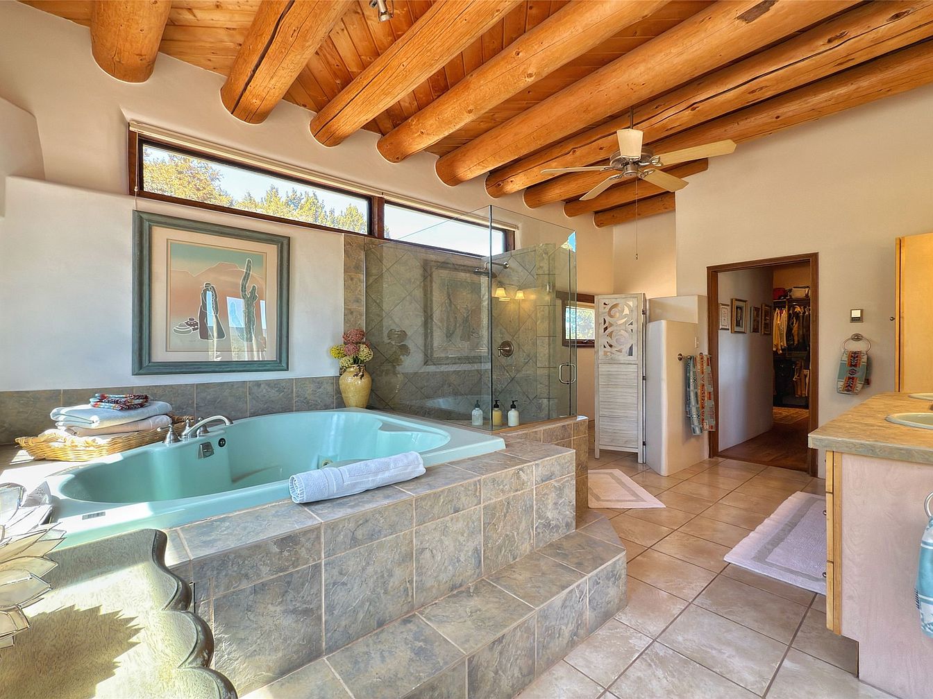 This spacious master bathroom features a sunken jacuzzi tub with surrounding stone tiles that create a relaxing nook. Adjacent is a glass-enclosed walk-in shower with matching tile and modern fixtures. The room highlights exposed, rustic wooden beam ceilings adding warmth and charm, complimented by neutral beige walls and earth-toned floor tiles. Large horizontal windows let in natural light, brightening the space while maintaining privacy. Double sinks on a wooden vanity provide ample counter space. Thoughtful decor includes a Southwestern-themed framed artwork and colorful textiles, harmonizing rustic and contemporary elements for an inviting atmosphere.